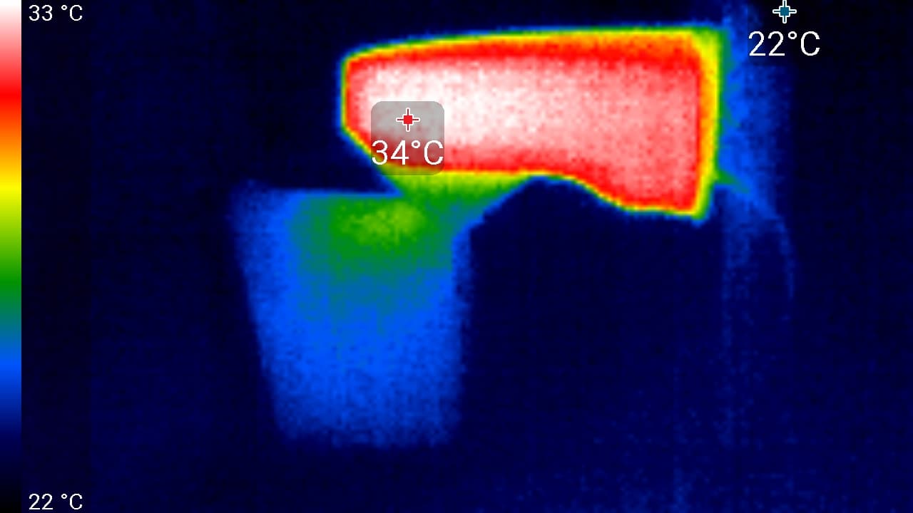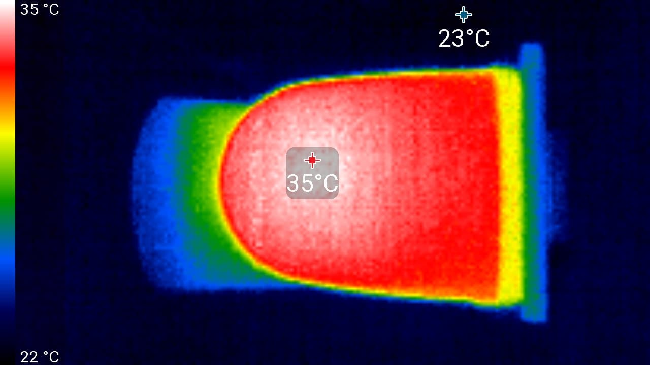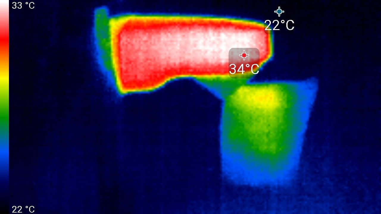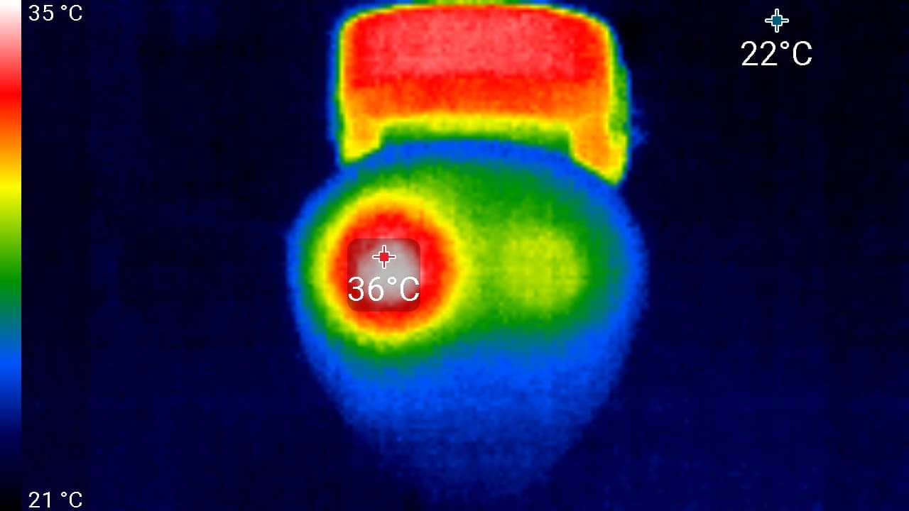 Наверное, нет занятия более странного, чем фотографировать тепловизор тепловизором. Хотя фотоаппараты ведь тоже иногда фотографируют фотоаппаратами. Следующие теплоснимки сделаны после многочасовой работы рассматриваемой камеры в теплом помещении. Можно видеть, что металлический кожух, в котором спрятана вся электроника, играет роль эффективного радиатора, отводящего тепло. Максимальный нагрев проявляется в верхней части кожуха, здесь температура его поверхности достигла 35 °C. Это абсолютно безопасная температура для электронных компонентов. А учитывая белый цвет корпуса, камеру вполне можно вывесить даже на солнце — никакого перегрева не произойдет.