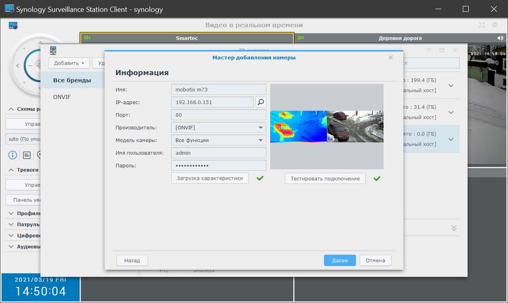 Более того, мы без труда подключили ее к домашней системе видеонаблюдения, работающей на NAS Synology. Благодаря ONVIF-совместимости, система получала не только двойную картинку, но и событийные триггеры с датчиков камеры.