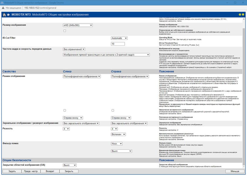 Благодаря хорошему переводу интерфейса, ни один пункт не вызывает вопросов. В общих настройках находятся всем понятные размер изображения, (де)активация инфракрасного фильтра, настройки PiP (Picture in Picture), отображение/разворот кадра на случай, если камера при установке была перевернута, резкость и шумоподавление, а также опция приватности, позволяющая закрыть непрозрачной маской нежелательные для записи зоны.