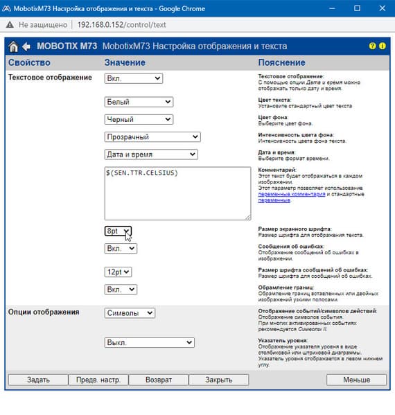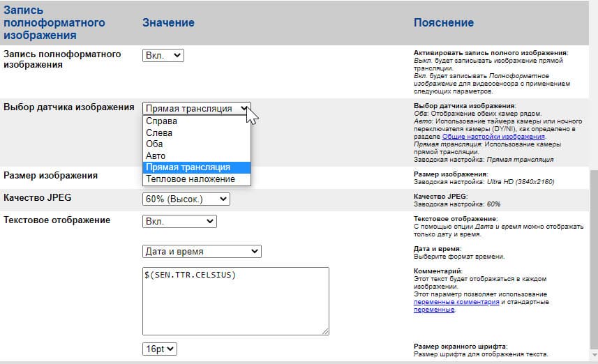 Как вы могли заметить, последний снимок, помимо собственно изображения, содержит также текстово-графическое дополнение в виде текущего времени и показаний термосенсора. Эта функция настраивается в подразделе, который так и называется: Настройка отображения и текста. Примечательно, что, помимо стандартных даты и времени, здесь можно вставить любой служебный параметр, примеры которых приведены в отдельных огромных списках. Например, строка $(SEN.TTR.CELSIUS) включает отображение минимальной и/или максимальной температуры, зафиксированной термосенсором.