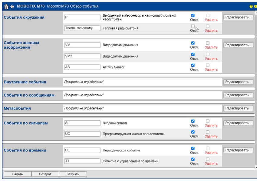 Чтобы перейти в детальные настройки события (любого, а не только избранного нами), следует нажать кнопку Редактировать. Но даже в таком, казалось бы, конкретном указанном событии, можно выбрать один из шести вариантов триггеров, от датчика удара до дифференциально-термического анализа (дельта). Мы выбрали пятый пункт, Тепловую радиометрию. Этот вид анализа позволяет инициировать событие, исходя из температуры, которая измеряется датчиком в указанной зоне кадра.