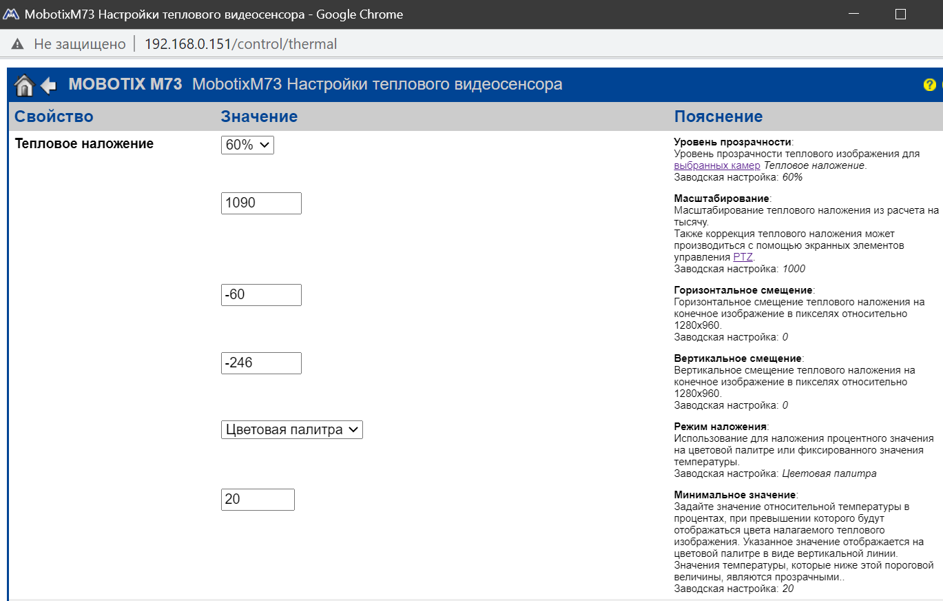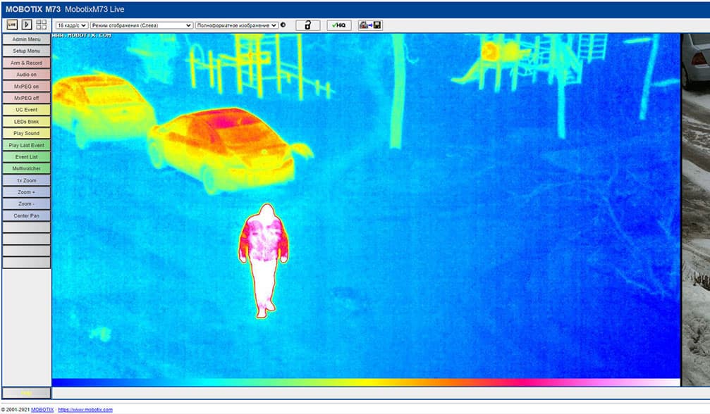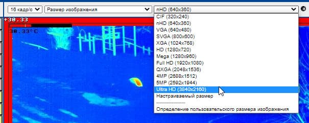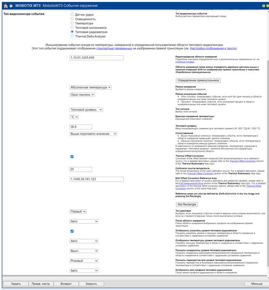 Задача была поставлена самая на сегодня злободневная: не допустить в контролируемую зону людей с повышенной температурой тела. Тепловая радиометрия тут подходит идеально. Достаточно указать верхний порог температуры, и если камера обнаружит в кадре объект с температурой, которая превышает указанное значение, то сработает триггер, запускающий тревогу. Прочие параметры, имеющиеся на этой страничке, отвечают за отображение числовых и графических данных в видеокадре.