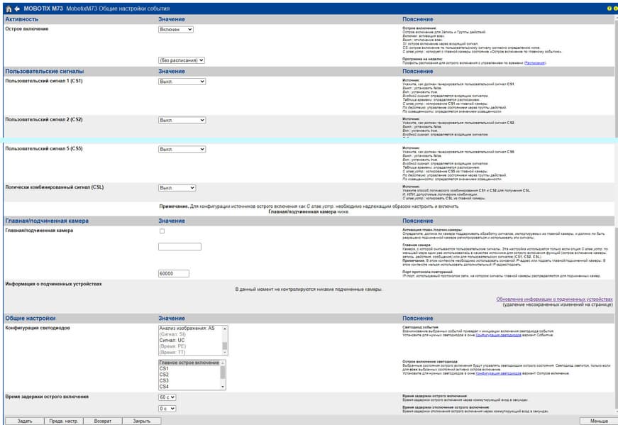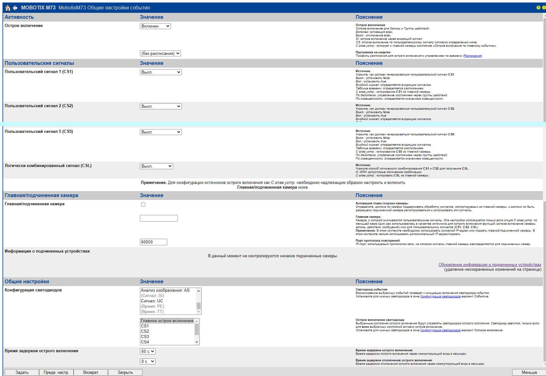 Вот мы и подошли к главному, без чего камера — это просто набор датчиков, всего лишь отображающих увиденное. Настройки событий. Тут сразу обращаешь внимание на оригинальный перевод, а именно — Острое включение. А мы предупреждали! В оригинальном интерфейсе — англоязычном — этот пункт называется Arming, что в данном контексте можно перевести как вооруженность, или готовность камеры к активным действиям. То есть, проще говоря, этот пункт активирует триггерно-тревожную функцию аппарата. Пока она выключена, все дальнейшие настройки событий будут заблокированы.