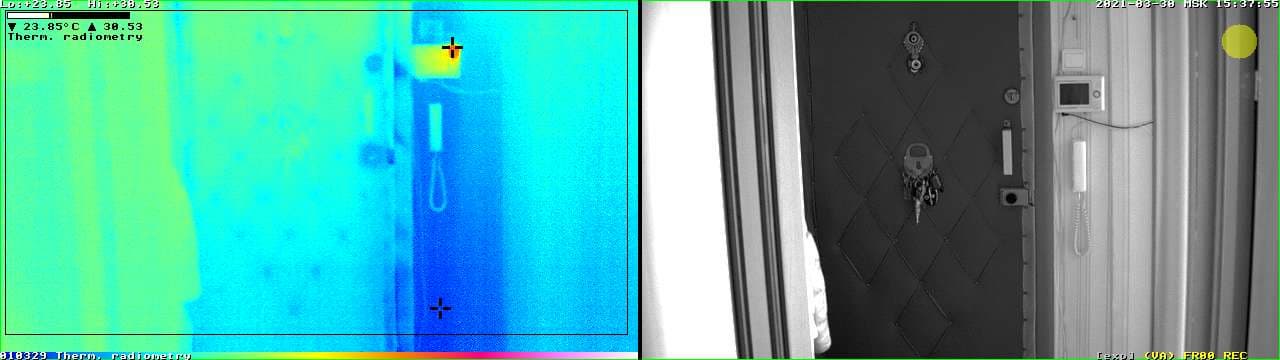 Также здесь имеется важный параметр — зона контроля, или область измерения. Она отображается рамкой, в углу которой по умолчанию выводится максимальная температура, либо минимальная и максимальная, если выбран параметр Тепловой диапазон. Но зачем эта область? Почему бы не анализировать весь тепловой кадр целиком? А вот почему: мы установили камеру под потолком длинного и узкого четырехметрового коридора, направив объективы на входную дверь. В результате в поле зрения тепловизора попал светильник, висящий справа от двери, чуть выше видеодомофона. Ведь, как мы помним, аспект картинки тепловизионного модуля составляет 4:3, то есть угол обзора по вертикали у тепловизора выше, чем у оптического модуля.