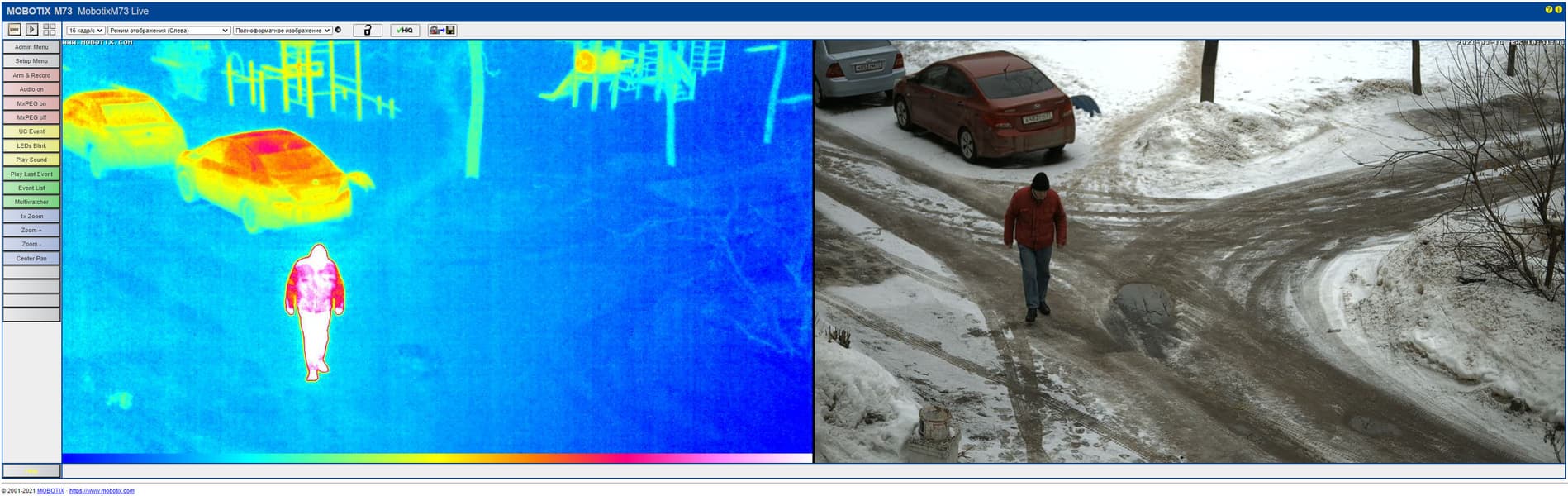 После авторизации пользователь увидит главное окно интерфейса с двумя видеопотоками: тепловизионным и оптическим. В левой части окна находятся разноцветные кнопки, отвечающие за вызов настроек и модулей.