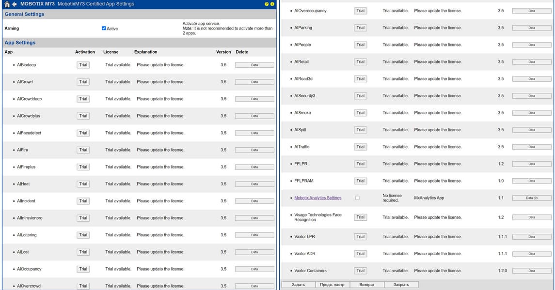 Ну а теперь — десерт. Встроенные в камеру приложения. Сразу уточним: программы, которые будут упомянуты, работают не в облаке, а исключительно в самой камере. Другое дело, что эти программы не бесплатны, однако для каждой из них существует trial-период. Они входят в состав прошивки, но остаются неактивными до тех пор, пока пользователь не решит задействовать эти участки мозга. Активация AI-приложений производится на отдельной страничке — Certified App Settings.