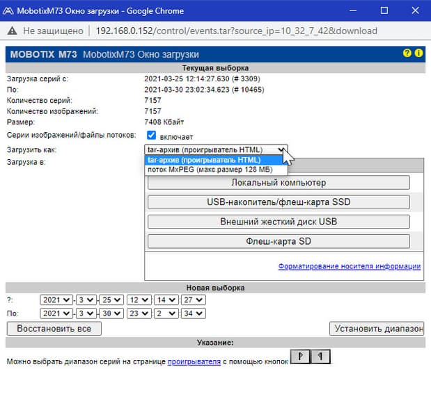 Ну и последний (пока) вопрос: как получить архив сделанных записей? Это нетрудно: на главной странице веб-сервера камеры имеются кнопки быстрого доступа как к последнему событию, так и ко всему имеющемуся списку. Пользователь может просмотреть события по одному, либо скачать выбранный интервал архива. Скачивание разрешается либо в виде MxPEG потока (эти файлы не могут иметь объем более 128 МБ), либо полным архивом с удобной индексной страничкой.