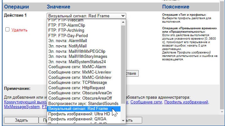 Теперь следующий шаг: настройка реакции камеры на тревожный триггер. Она производится в пункте Обзор группы действий. Здесь не зря применено слово «группа», а не просто «действие». Дело в том, что камера способна реагировать на событие не одним действием, а несколькими. В качестве таковых могут выступать выгрузка контента на FTP, отправка сообщения на E-Mail, запуск сообщения во внутреннюю сеть Mobotix и другие действия. В одной группе может находиться несколько разных действий (да хоть все!), групп также можно создать несколько.