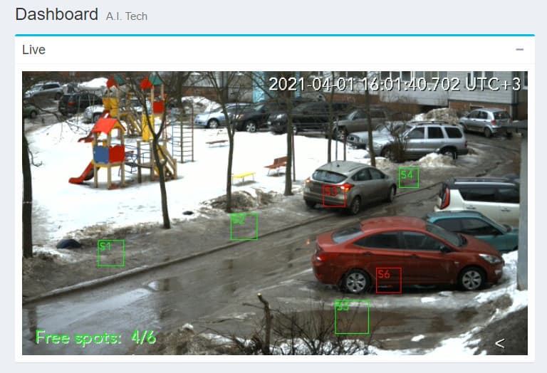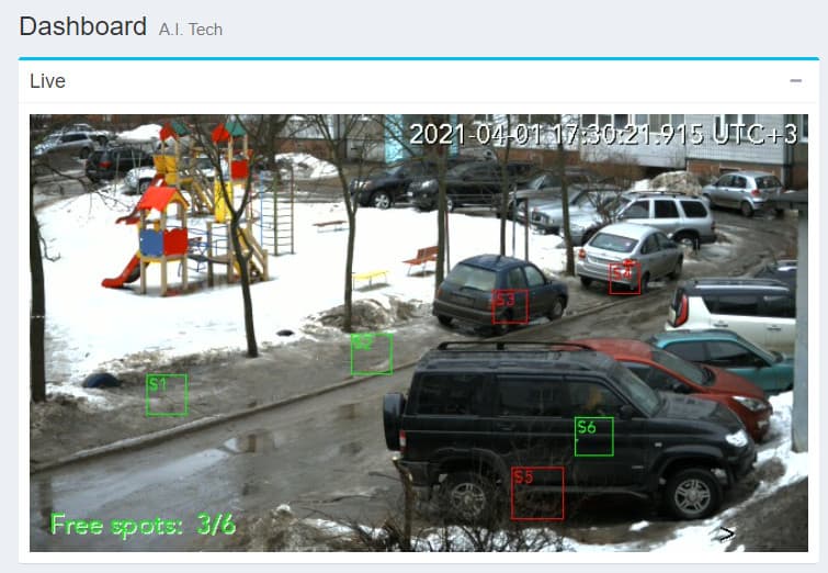 А теперь — внимание! На следующем скриншоте отчетливо видно, что камера расположена слишком низко над «парковкой», из-за чего некоторые парковочные места (в данном случае место, обозначенное S6) перекрываются автомобилями, расположенными ближе к камере. Программа в этом случае решила, что 6-е место свободно, хотя оно занято красным автомобилем.