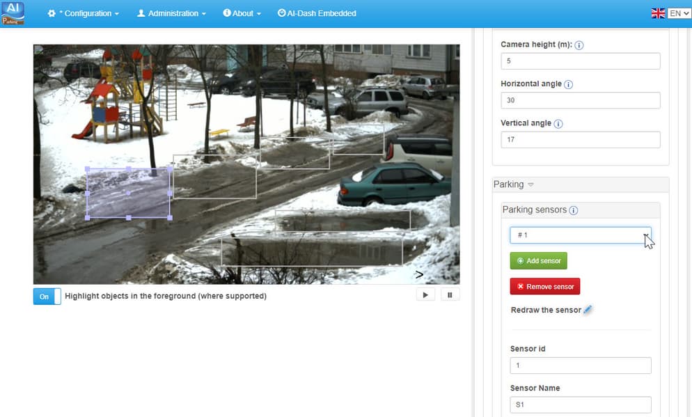 Настройки этого программного модуля (как и всех прочих) вполне очевидны, хотя и отличаются в зависимости от назначения приложений. Так, одним из главных параметров приложения AI Parking является калибровка. Она заключается в указании высоты расположения камеры над парковкой (в метрах), а также в углах обзора объектива. Вероятно, эти данные нужны программе для того, чтобы она смогла вычислить примерные размеры автомобилей в кадре и на основании результатов понять, что парковочное место занято именно автомобилем, а не мусорным пакетом. Парковочные места указываются (рисуются) мышкой непосредственно в просмотровом окне.