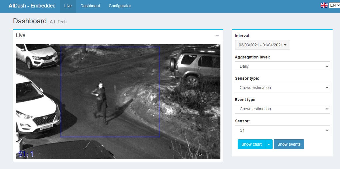 Второе приложение, пробную версию которого мы активировали — AI Crowd. Эта программа предназначена для определения количества людей в наблюдаемой зоне. Ее настройки также содержат высоту размещенной камеры и углы обзора объектива, что говорит о сходной математике, анализирующей картинку.