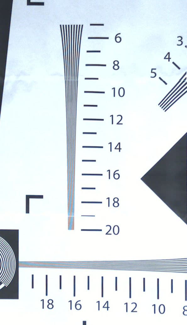 Одно из главных требований к камерам наблюдения — высокая детализация. Ее несложно измерить, сняв тестовую таблицу (в нашем случае — ключевой кусочек таблицы). Результат оказался довольно солидным: около 1400 ТВ-линий по горизонтальной стороне кадра. Такая разрешающая способность характерна для хороших 4K-видеокамер среднего и высшего ценового диапазона (картинка кликабельна).
