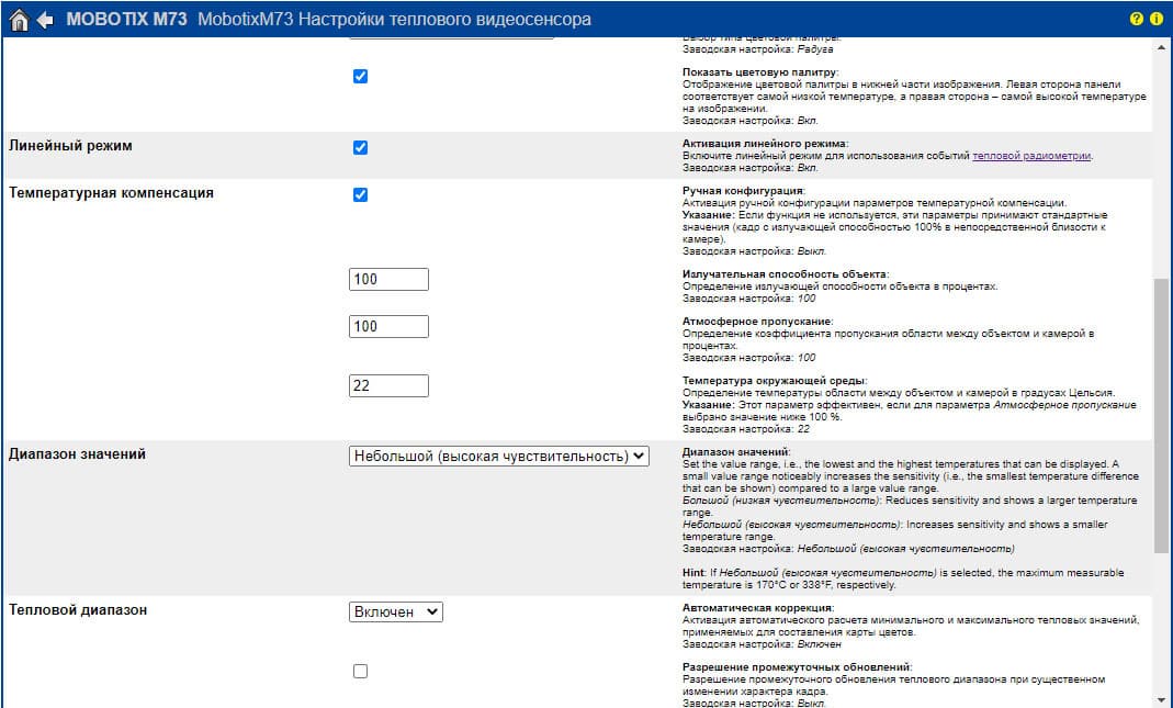 Наконец, последний подраздел, относящийся к визуальным настройкам сенсоров: Настройки теплового видеосенсора. Часть параметров, отвечающих за тепловизионную картинку, была показана ранее. Но отметим наличие дополнительных инструментов, которые играют важную роль в точности определения температур. В частности, такая функция, как Температурная компенсация. Здесь производится скрупулезная подстройка температурного сенсора с учетом обстановки и окружающей среды, вплоть до указания точной температуры воздуха. Еще один важный параметр — Диапазон значений, который нужно менять в зависимости от величины температур объектов в кадре. Если этого не сделать, то при большом разбросе температур датчик может неверно определить нижнюю или верхнюю границу.