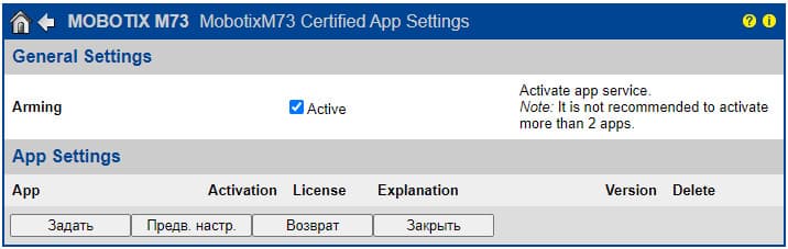 В целях тестирования мы активировали несколько приложений с разным назначением, начав с AI Parking. После активации приложения камеру требуется перезагрузить, лишь теперь ссылка на страничку настроек станет активной.