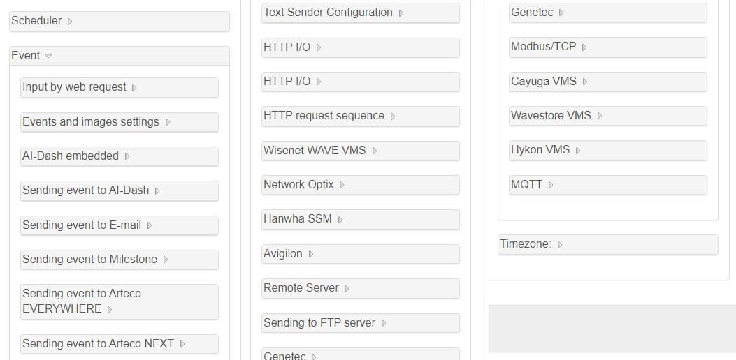 Прочие настройки отвечают за реакцию камеры на то или иное событие. Цепочка «событие—реакция» в камере Mobotix построена следующим образом: аналитические программы, работающие непосредственно в «мозгах» камеры, формируют результат распознавания в виде кодовой последовательности, напоминающей стандарт JSON, которая поступает во внутреннюю систему сообщений Mobotix. Заранее настроенный событийный триггер «слушает» этот MxMessage, и срабатывает при определенных параметрах, поступивших с модуля распознавания.