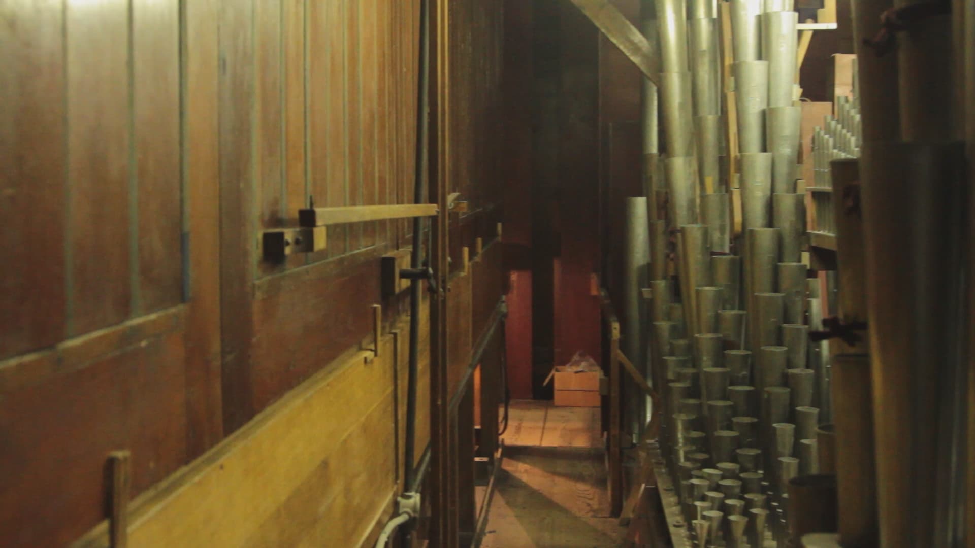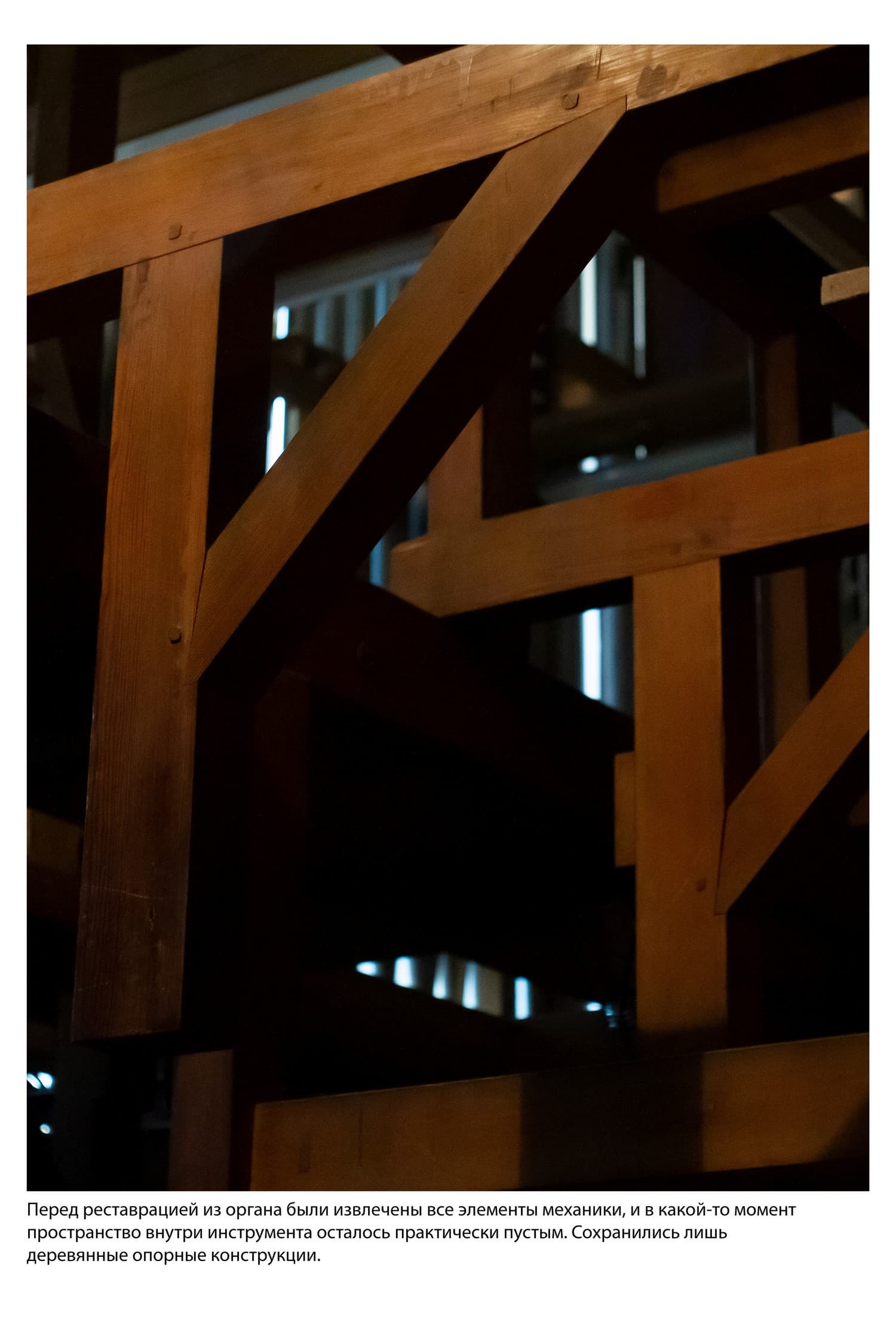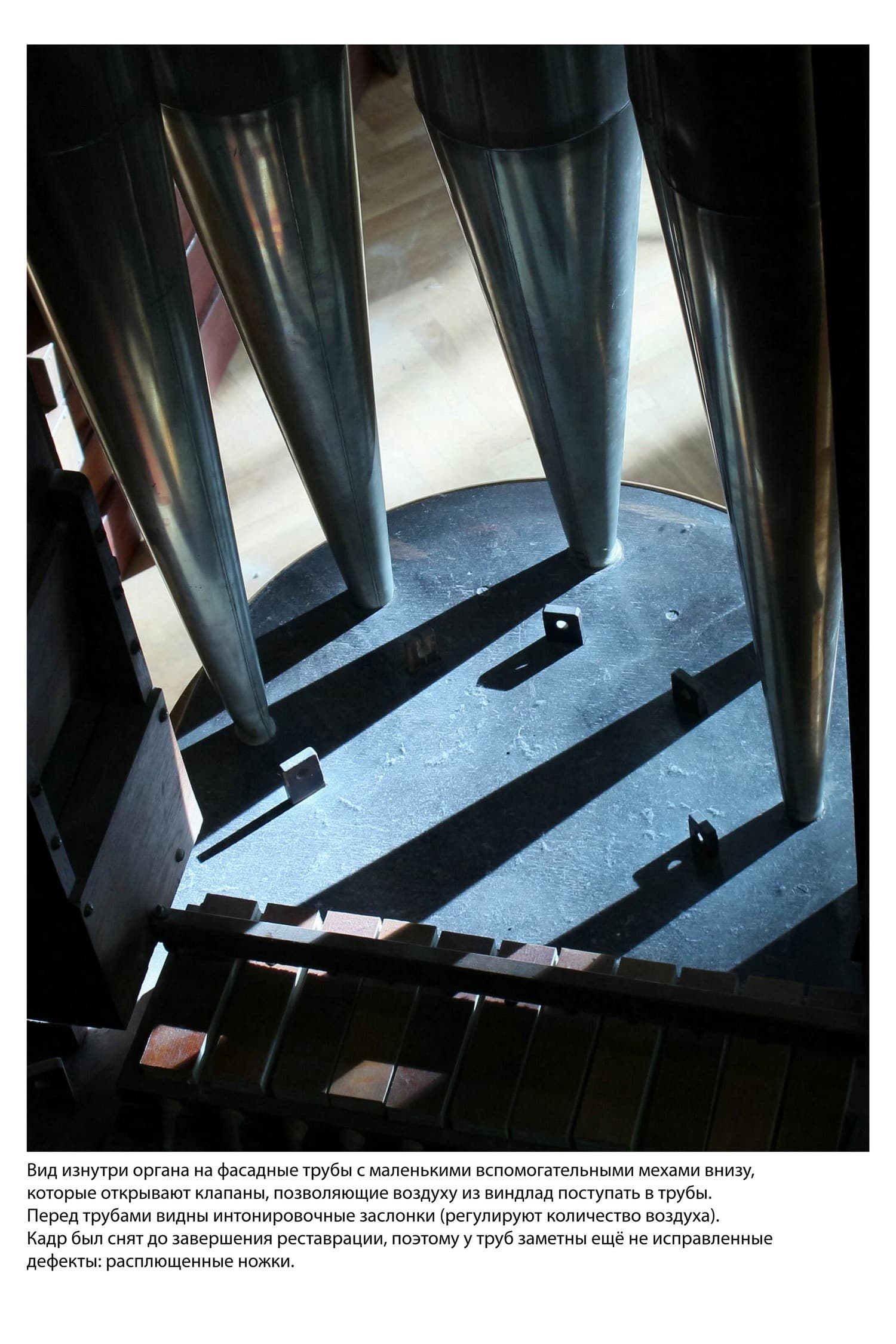 Комментарий Сергея Уварова: Когда документальное кино снимается в каком-то уникальном здании или объекте, который и выступает главным героем фильма, во главу угла необходимо ставить сохранность этого объекта. Кроме того, задача оператора — завоевать максимальное доверие хранителя. В нашем случае таким человеком была Наталья Малина, главный органный мастер консерватории, уникальный специалист. Во многом благодаря ее усилиям орга́н существует и функционирует по сей день. Ее помощь была бесценна и для нашей работы. Однако поначалу, когда мы с Антоном только познакомились с ней, она не позволила внести в орга́н даже штатив (и совершенно справедливо: кто их знает, этих киношников?). Поэтому некоторые сцены до реставрации были сняты вообще с рук. Отчасти это компенсировалось при монтаже программной стабилизацией в Final Cut Pro X. Но некоторые дрожания остались и даже оказались весьма уместны.