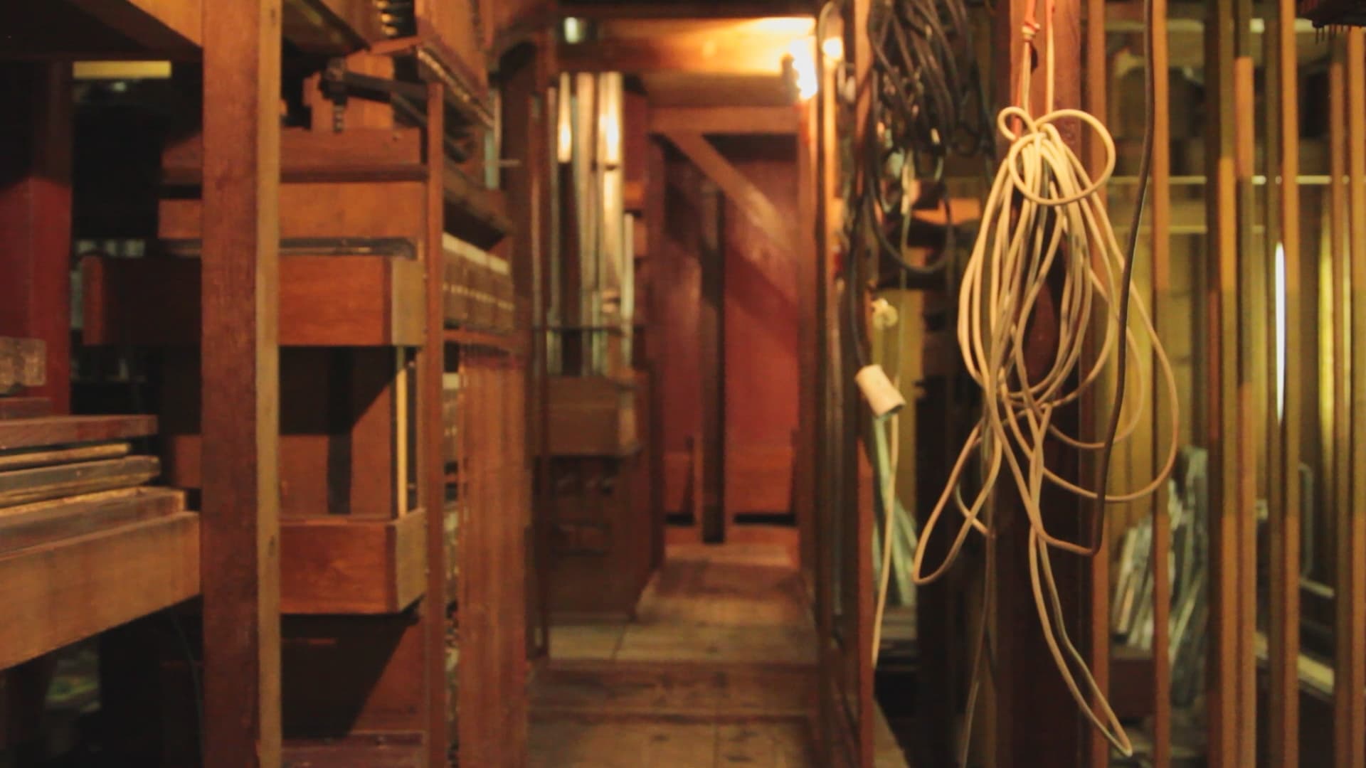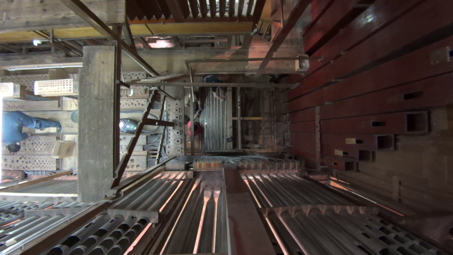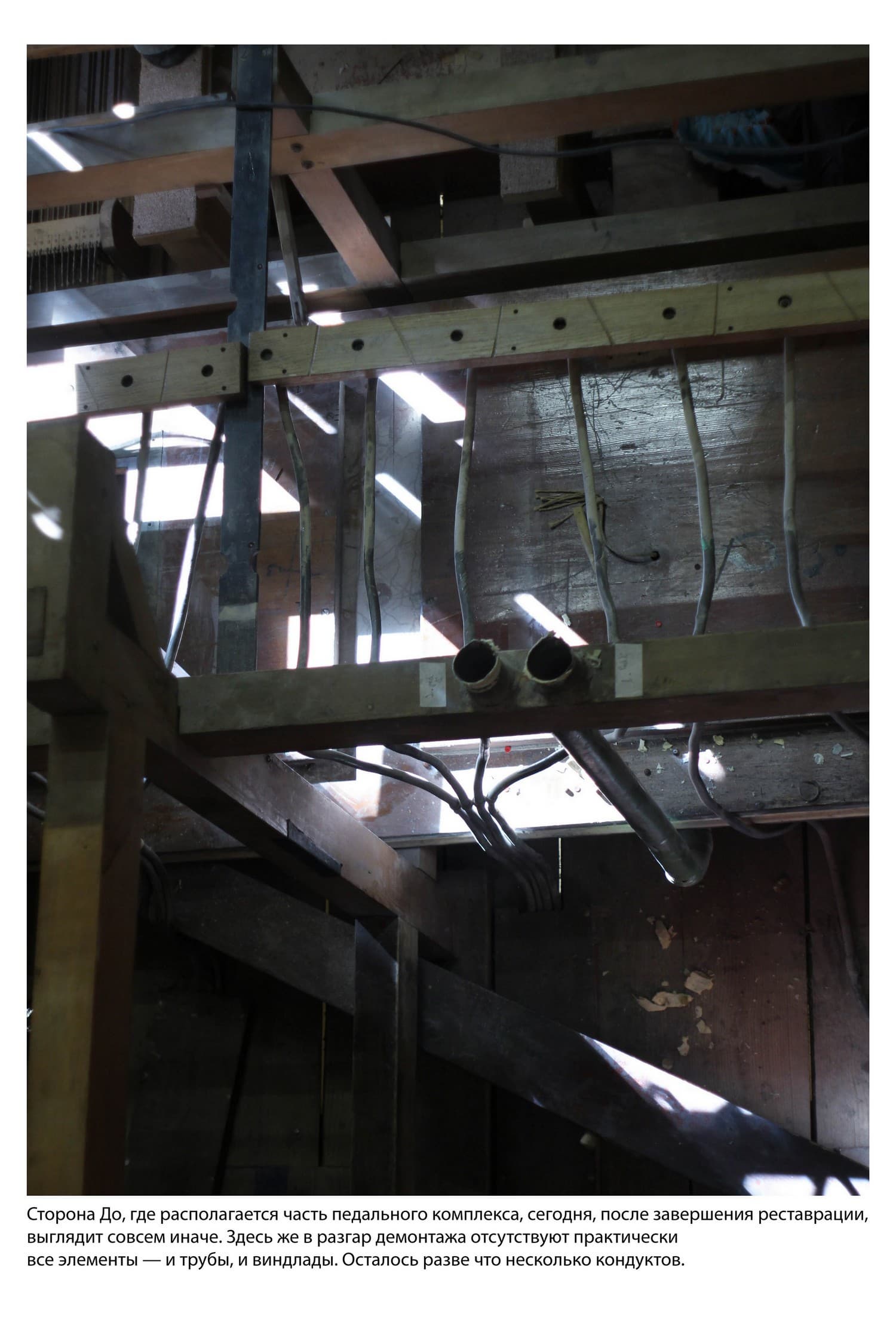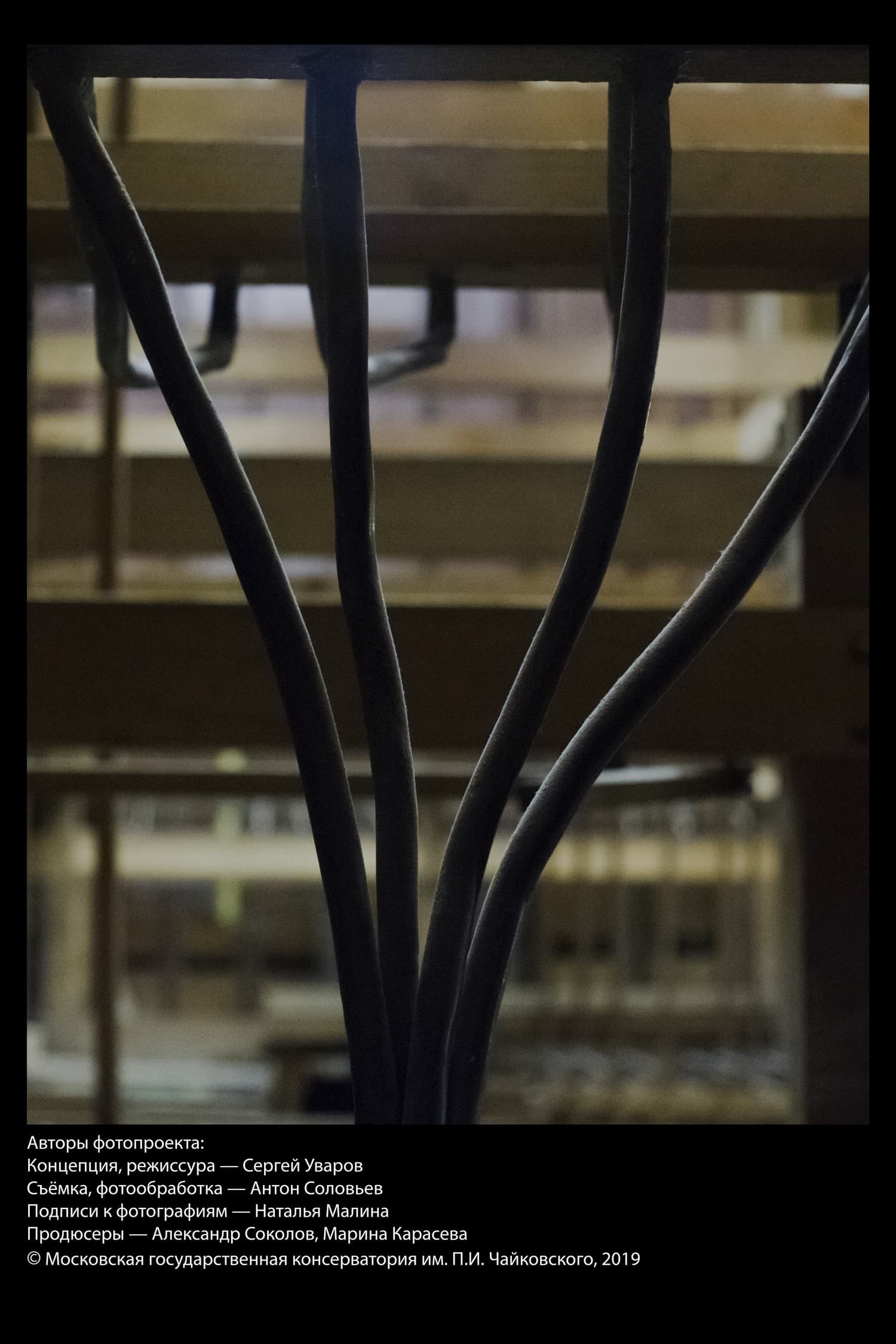 Комментарий Сергея Уварова: Когда документальное кино снимается в каком-то уникальном здании или объекте, который и выступает главным героем фильма, во главу угла необходимо ставить сохранность этого объекта. Кроме того, задача оператора — завоевать максимальное доверие хранителя. В нашем случае таким человеком была Наталья Малина, главный органный мастер консерватории, уникальный специалист. Во многом благодаря ее усилиям орга́н существует и функционирует по сей день. Ее помощь была бесценна и для нашей работы. Однако поначалу, когда мы с Антоном только познакомились с ней, она не позволила внести в орга́н даже штатив (и совершенно справедливо: кто их знает, этих киношников?). Поэтому некоторые сцены до реставрации были сняты вообще с рук. Отчасти это компенсировалось при монтаже программной стабилизацией в Final Cut Pro X. Но некоторые дрожания остались и даже оказались весьма уместны.