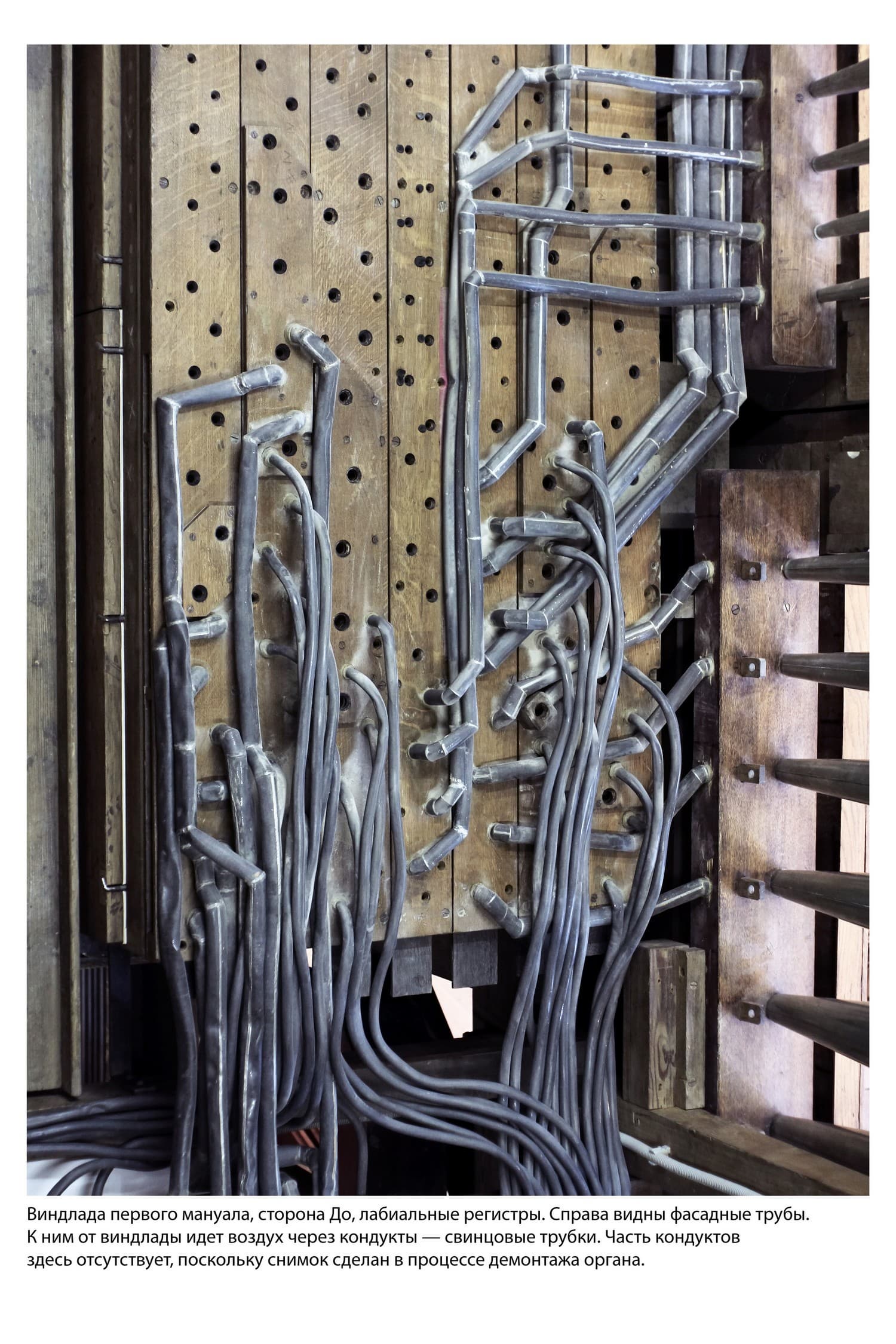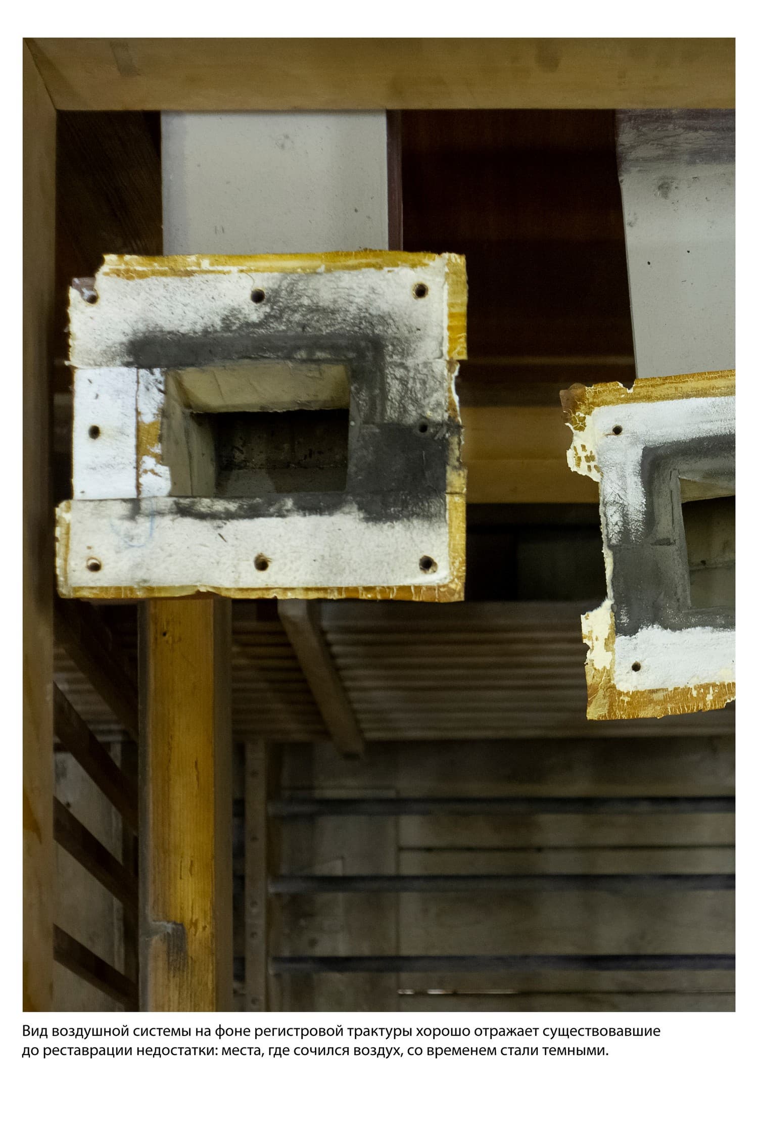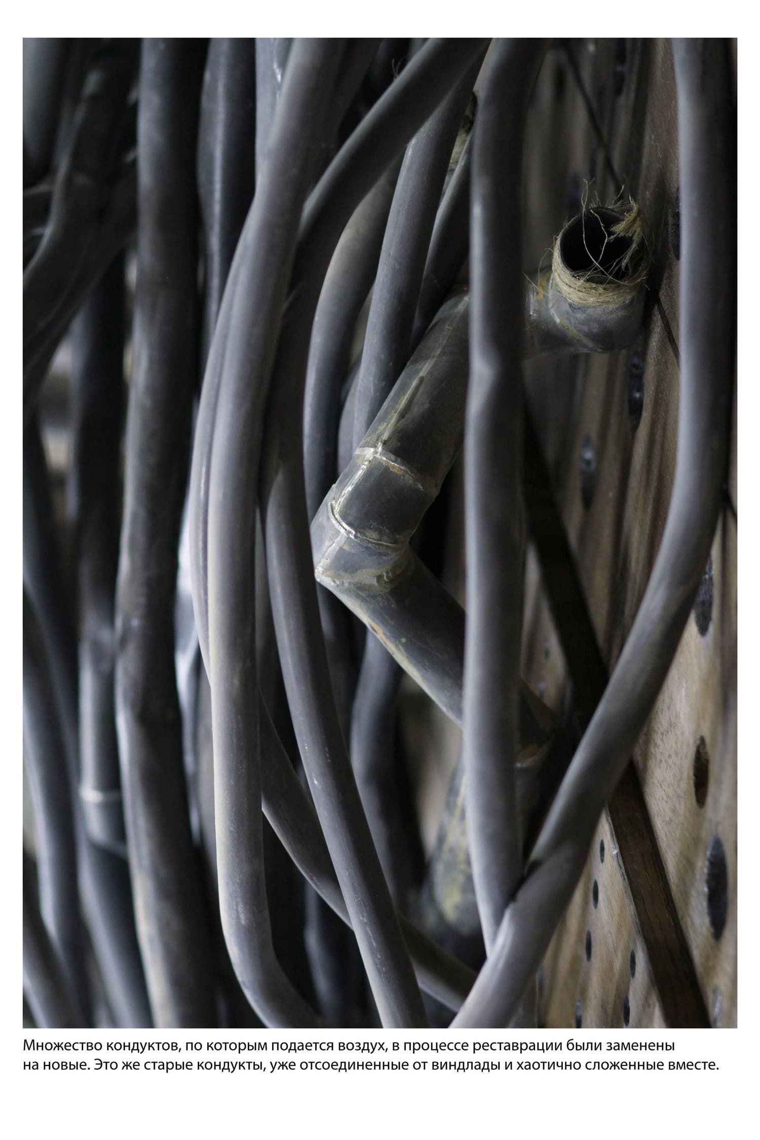 И вторая проблема: использовать дополнительное освещение типа больших студийных ламп в орга́не категорически нельзя. Во-первых, они туда просто не поместятся, а во-вторых, любой перегрев чреват возгоранием. И учитывая, что вся основа инструмента деревянная, никакая противопожарная система не спасет.