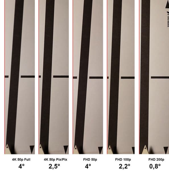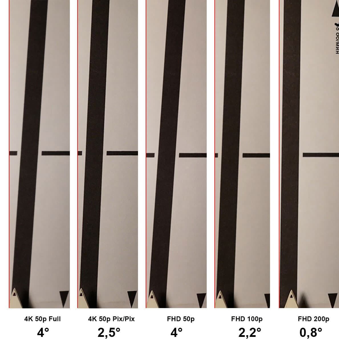 Измерение показало, что в рассматриваемой камере роллинг-шаттер дает максимальный наклон в 4° в режиме съемки 4K 50p. Если переключить камеру в режим съемки пиксель-в-пиксель, то наклон уменьшается до 2,5. Это объясняется тем, что в режиме пиксель-в-пиксель сканируется меньшая площадь сенсора, а значит, на сканирование затрачивается меньшее время. В Full HD-съемке, помимо режима пиксель-в-пиксель, можно увеличить частоту кадров до 100 и даже до 200 в секунду. Минимальный наклон вертикалей (а значит, и степень роллинг-шаттера) дает съемка в Full HD с частотой 200 кадров в секунду. Здесь наклон составил менее одного градуса.