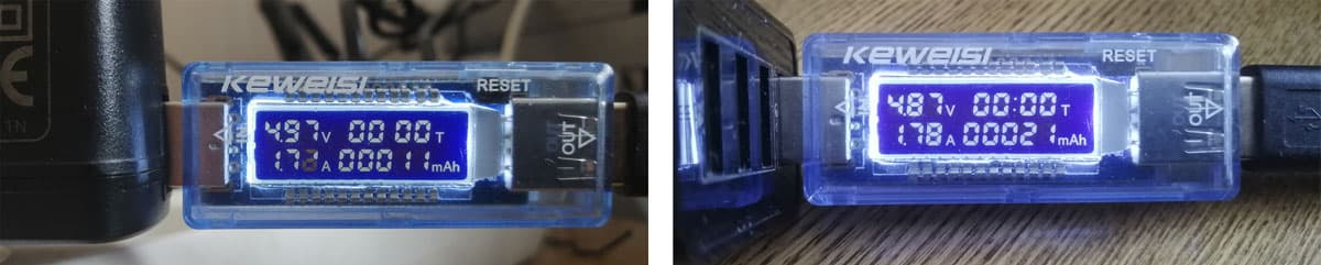 Никак нет. Зарядное устройство отбирает ровно ту энергию, которую дает «родной» адаптер, не выше 1,8 А. Этот факт немножко расстраивает, ведь два с половиной часа на зарядку аккумулятора — это и в самом деле очень долго. Но, с другой стороны, такое относительно скромное потребление энергии дает надежду на использование переносных 5-вольтовых батарей для долгой автономной съемки «в полях». Да, обычных пауэрбанков, даже со скромными характеристиками. Вот, камера спокойно заряжается и даже работает от старенького пауэрбанка, который выдает 5 В 1 А.