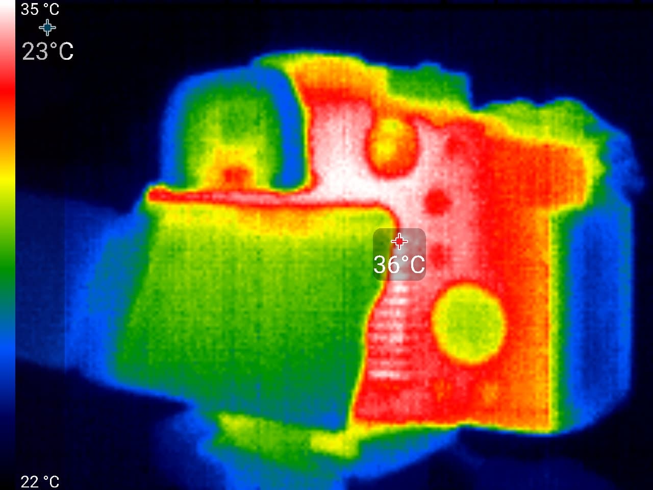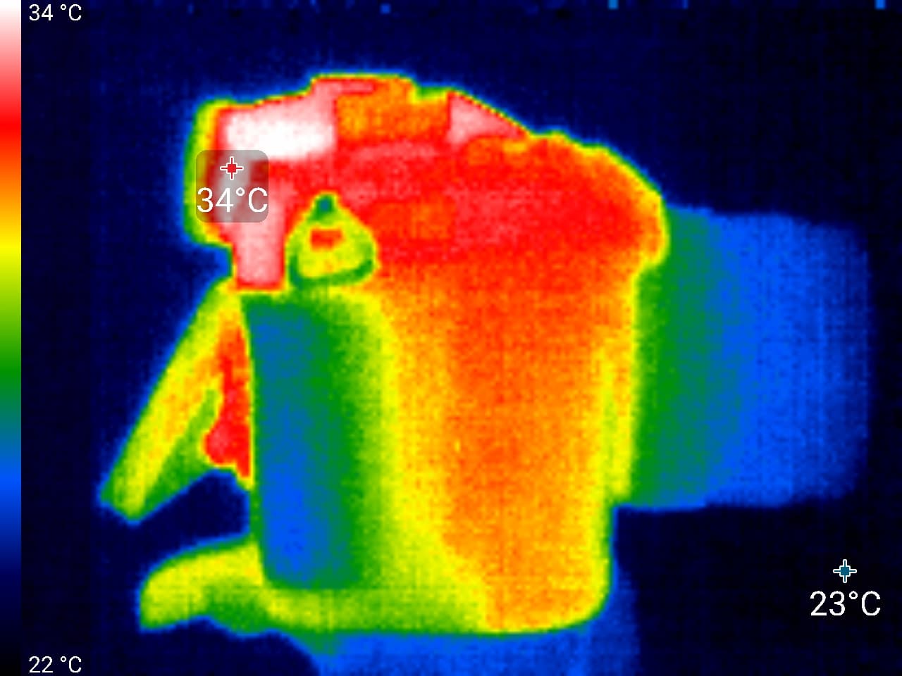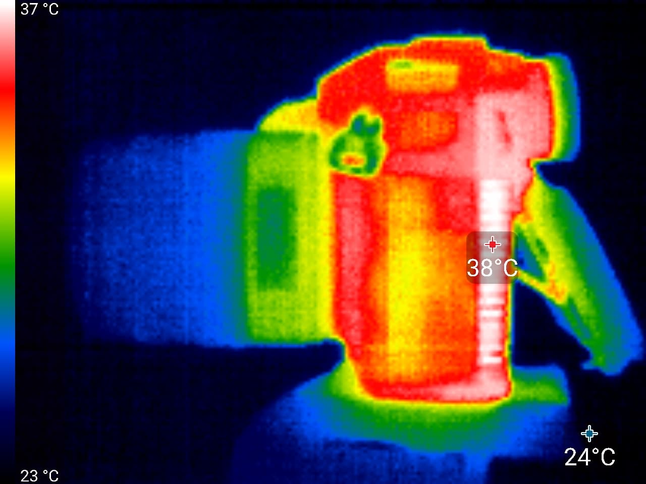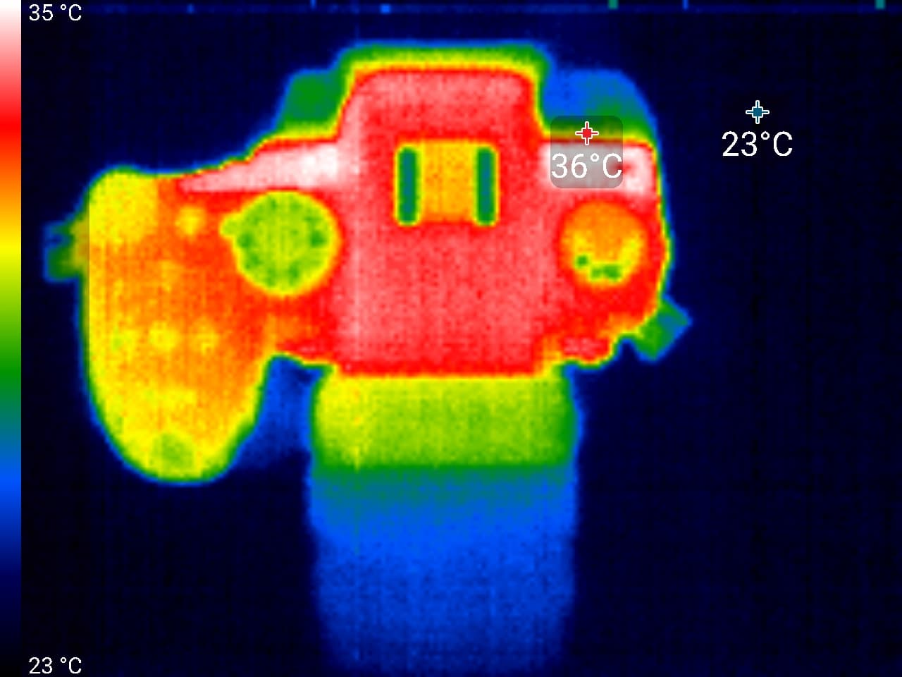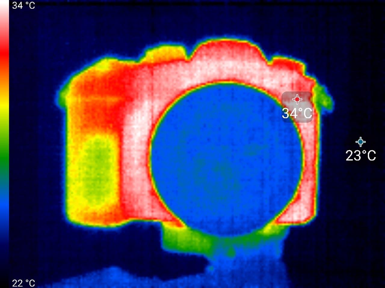 Но насколько эффективно такое решение? Отвечаем: очень эффективно! Следующие теплоснимки сделаны после часа непрерывной видеозаписи в режиме 4K 25p при работающем дисплее. Камера находилась на штативе и работала от аккумулятора.