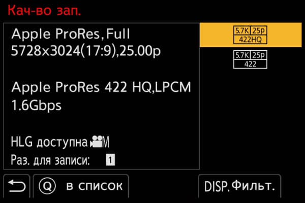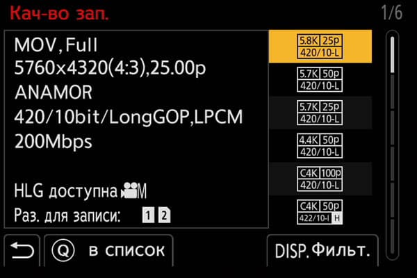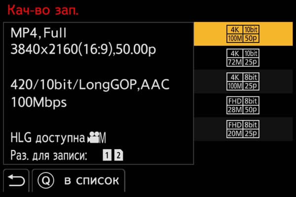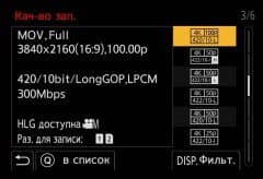 Что касается используемых кодеков — тут тоже все очень непросто. В контейнерах MP4 и MOV камера использует два кодека: AVC (H.264) и HEVC (H.265). Использование первого или второго зависит не только от размера и частоты кадров, но и от битности. Так, видео 4K/8bit/100M/30p записывается в AVC, а при записи 4K/10bit/72M/24p уже используется HEVC. Даже некоторые Full HD-режимы тоже используют HEVC.