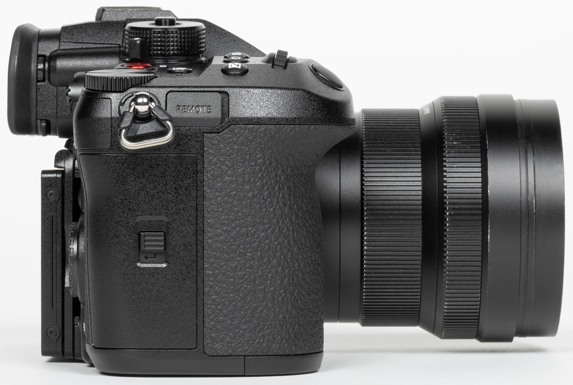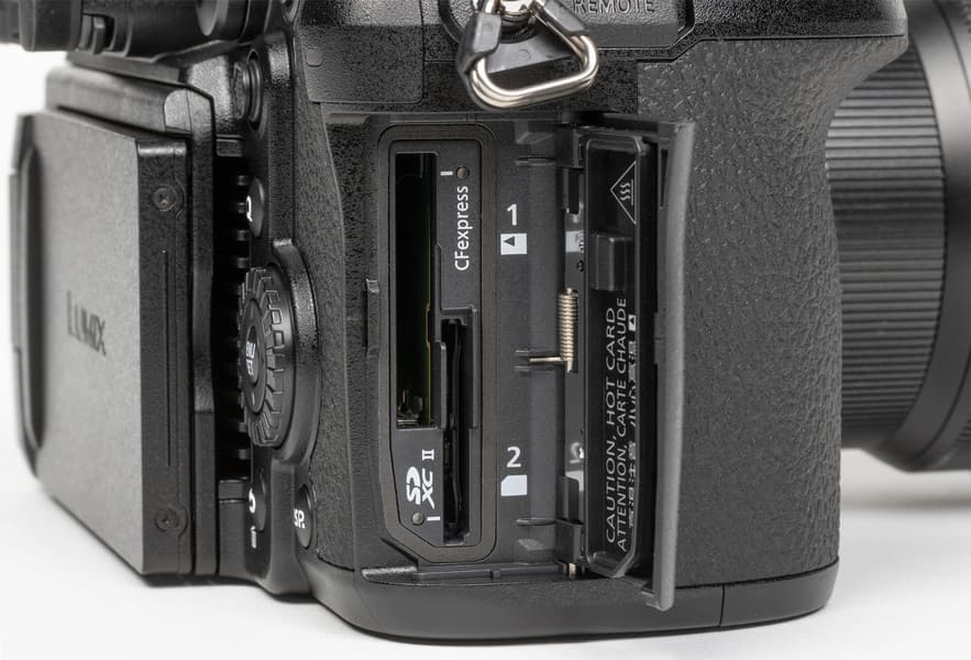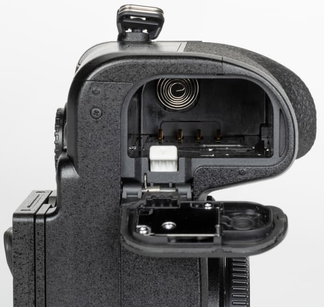 Правая сторона корпуса также содержит откидную крышку. Под ней расположены два слота для карт памяти CFexpress и обычных SD/SDHC/SDXC. Рядом с каждым слотом имеется миниатюрный светодиодный индикатор, мигающий при обращении к карте. Интересно, зачем эти индикаторы, если крышка всегда закрыта? Впрочем, их наличие говорит о похвальной скрупулезности разработчика.