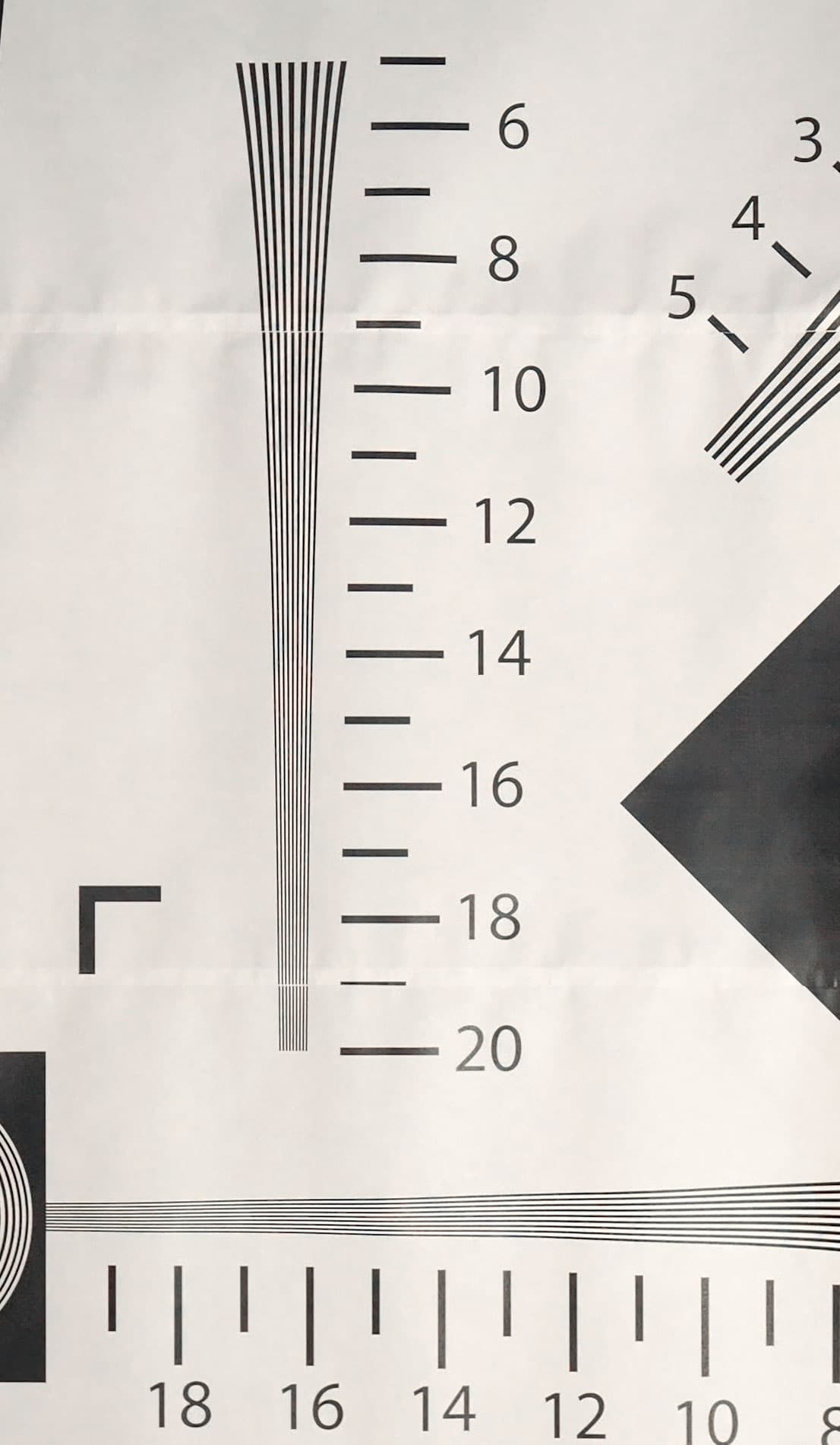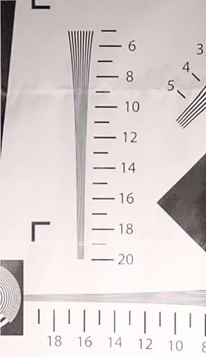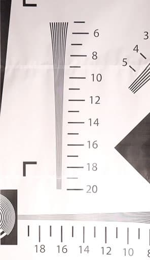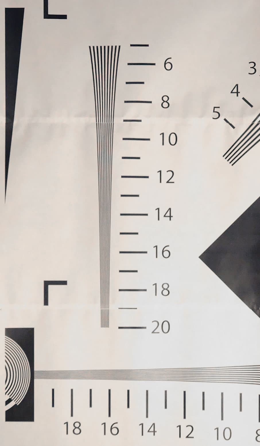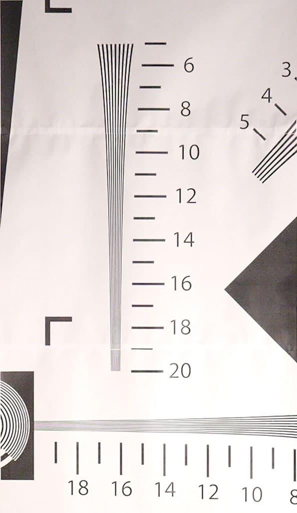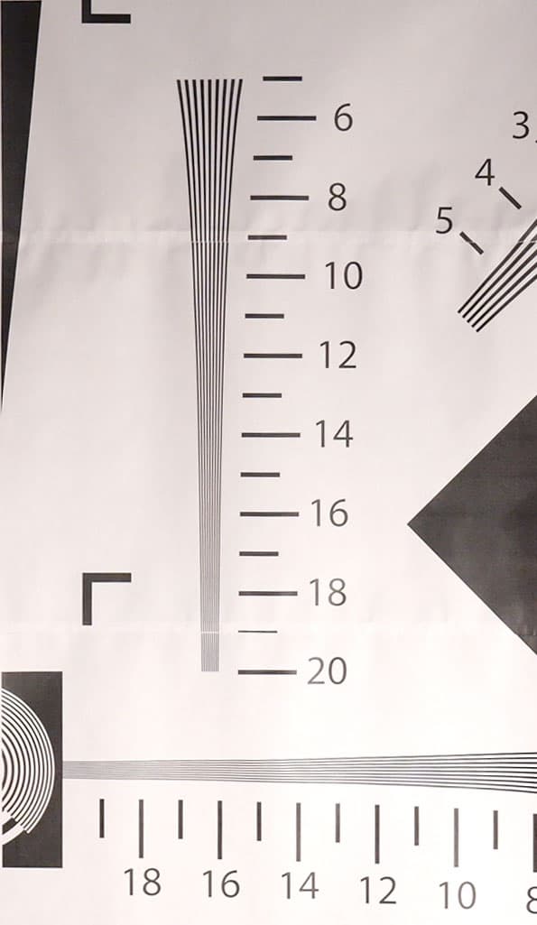 Разрешающая способность камеры в старшем режиме съемки (5760×4320) уверенно переваливает за возможности тестовой таблицы. То есть больше 2000 ТВ-линий по горизонтальной стороне кадра. Да, пора переходить на более современные таблицы. Вот только какого же размера они должны быть, если даже этот кусок составлен из трех листов A3?
