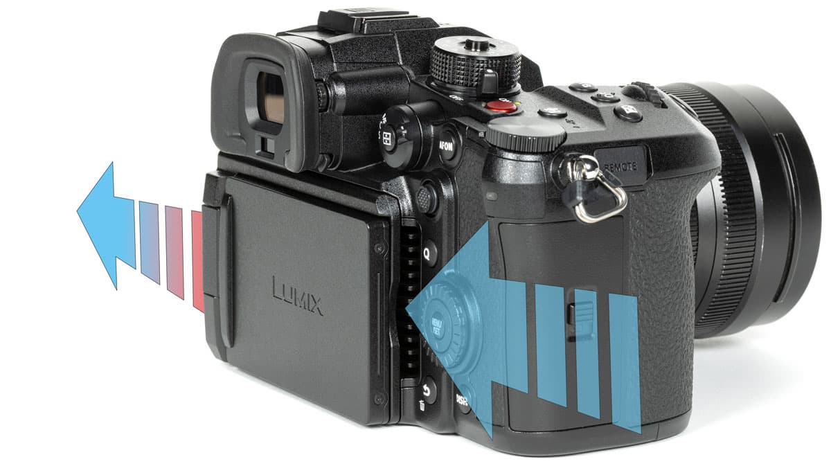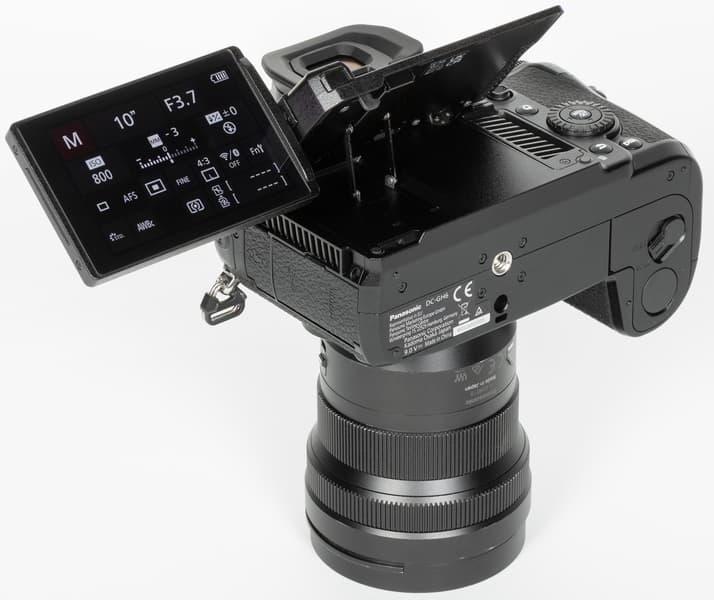 Сенсорный экран имеет хитрую конструкцию, которая позволяет наклонить и повернуть его как угодно, это кардинально облегчает процесс съемки. Под откидной пластиной, к которой крепится экран, находится еще одна вентиляционная решетка, но предназначенная для забора воздуха.