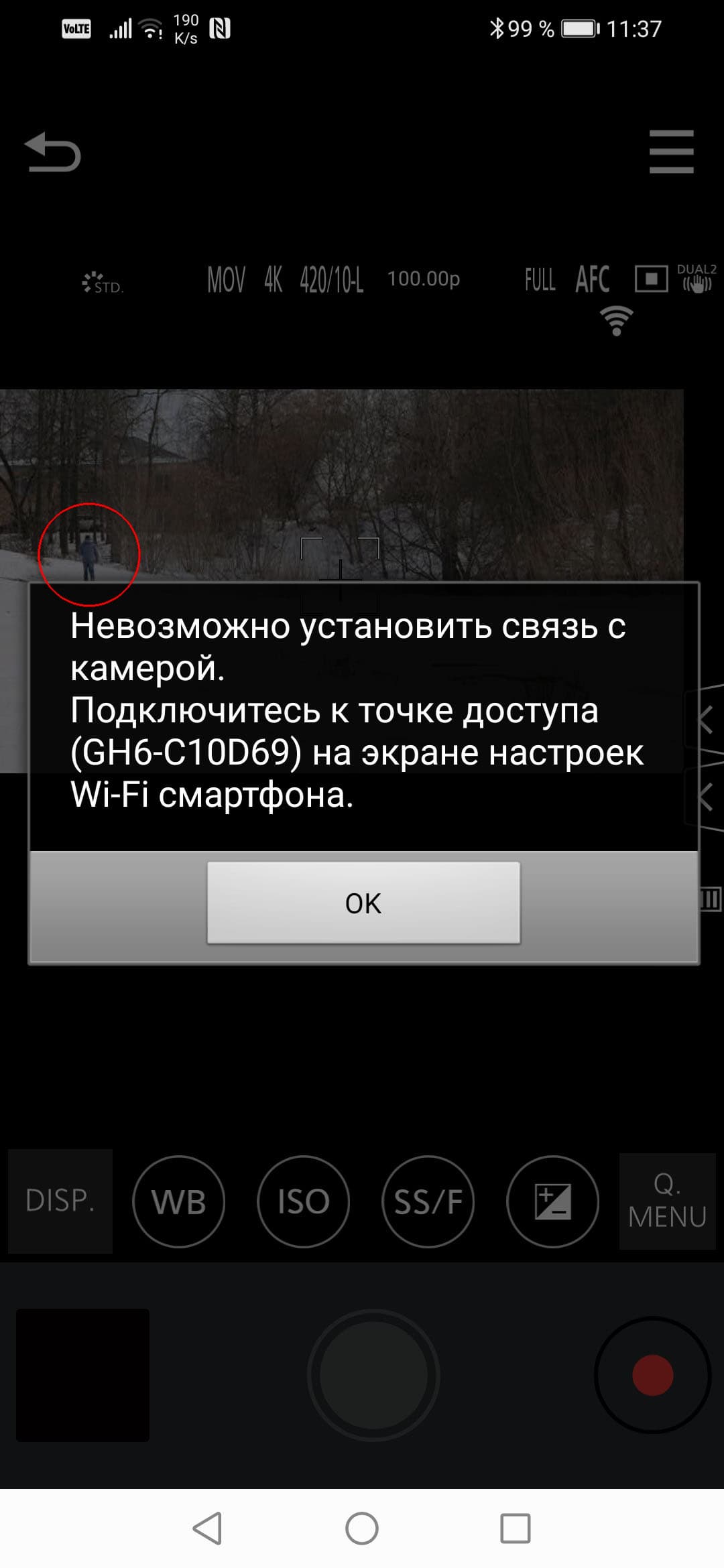 Расстояние, на котором удерживается устойчивая связь между камерой и смартфоном, достигает 45-50 метров при условии прямой видимости и отсутствии преград. Стоит отдалиться еще немного — связь порвется и видеотрансляция остановится. На скриншоте с сообщением о разрыве связи можно видеть оператора, который отошел слишком далеко.
