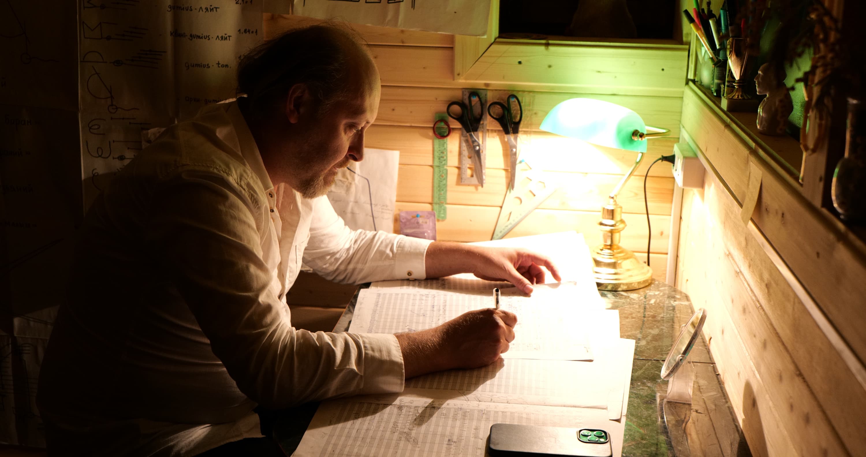 Нам нужно было ощущение абсолютной интимности, даже сакральности ситуации. Композитор находится наедине, ночью, и переживает некий душевный кризис. Поэтому хотелось, во-первых, большого количества черного цвета, темноты, указывающей еще и на время суток — ночь, а во-вторых, здесь нужны были драматичные контрасты и тени. И, конечно, картинка должна быть благородной. Камера Panasonic справилась с этими задачами.