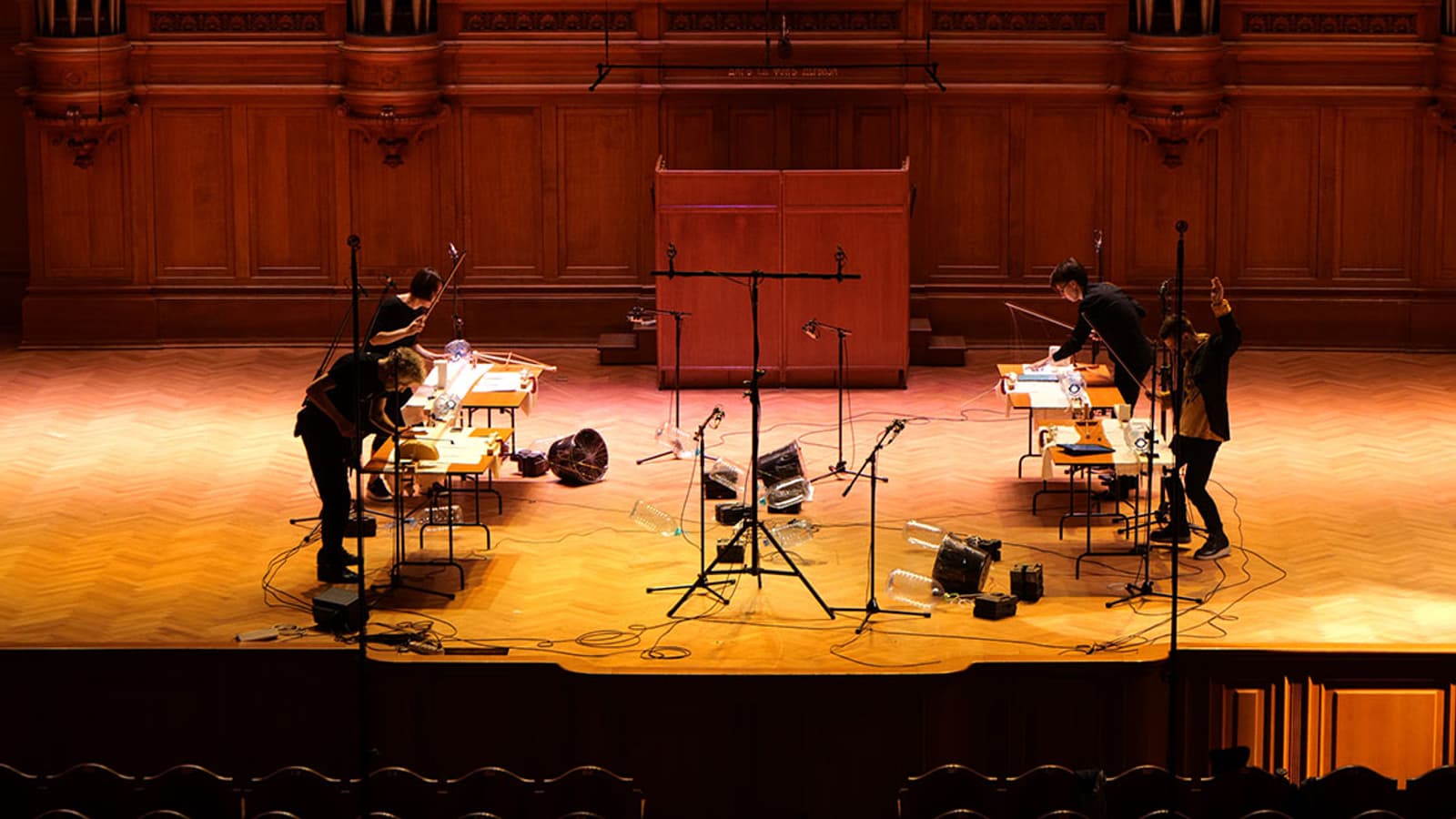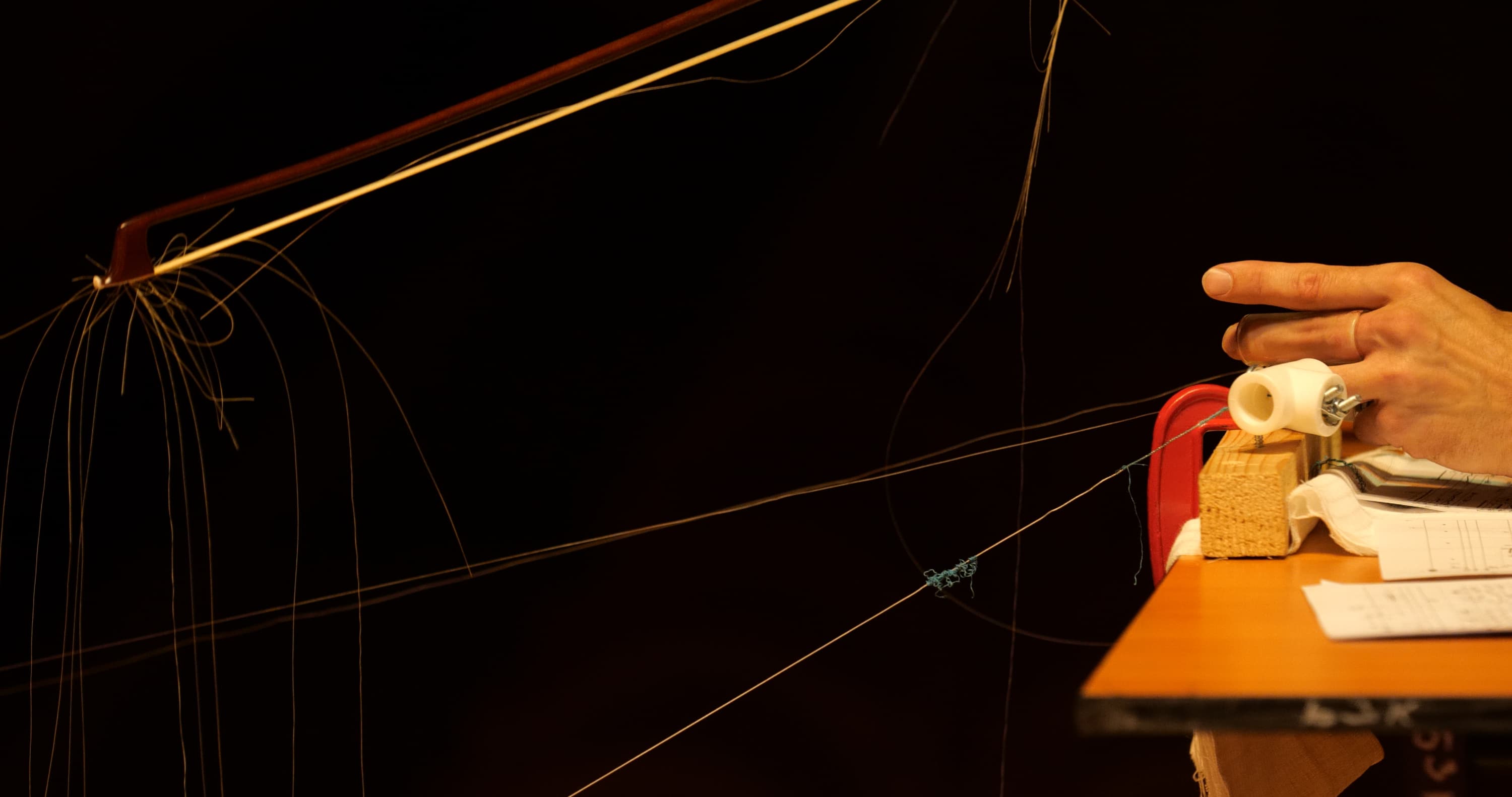 Поскольку мы имели все основания рассчитывать на высокое качество модели Panasonic, мы решили использовать ее в особо сложных эпизодах. В первом случае — во время записи в БЗК — нам были крайне необходимы сверхкрупные планы. Специально для фильма производилась запись очень необычного произведения, исполнение которого само по себе выглядит художественной акцией: исполнители извлекают звуки из натянутых между партами лесок, пустых ведер и бутылок, кусков пенопласта. Разумеется, все это надо показывать во всех деталях. Но как это осуществить без помех для звукозаписи? Есть два варианта: либо снимать издалека, но с очень мощным зумом, либо выйти на сцену и снимать оттуда, желательно с рук. Но тогда камера должна быть совершенно бесшумной. Мы испробовали оба.