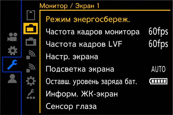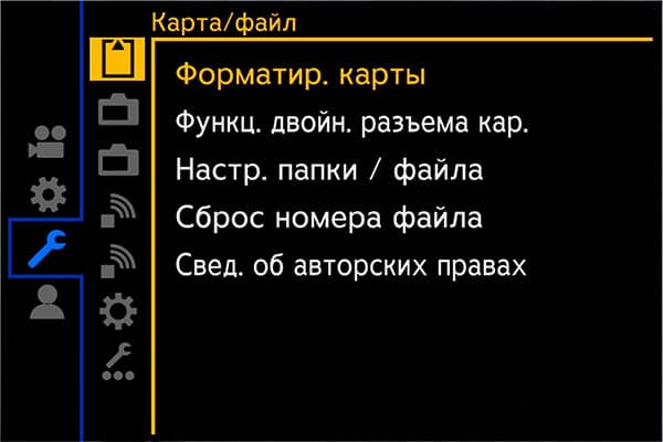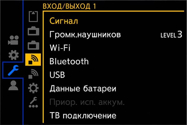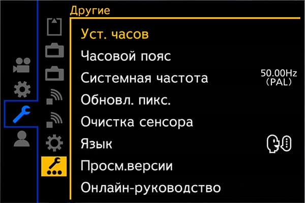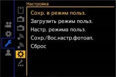 Системные настройки позволяют отформатировать карты памяти, определиться с методом записи на них, изменить частоту кадров, яркость и другие параметры монитора и видоискателя, выбрать функции соединения по кабелю, Wi-Fi и Bluetooth, сохранить или загрузить пользовательские настройки аппарата.