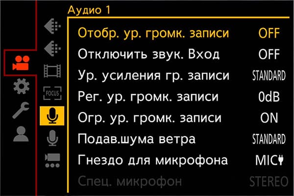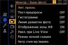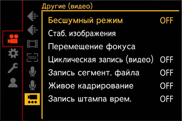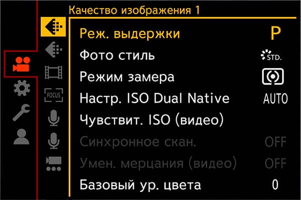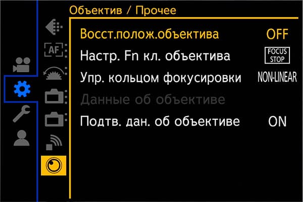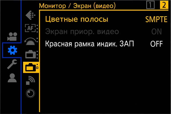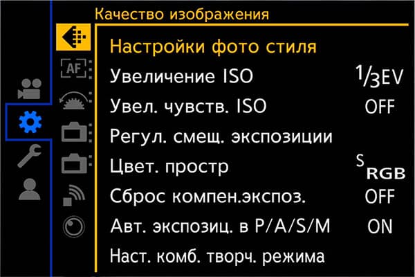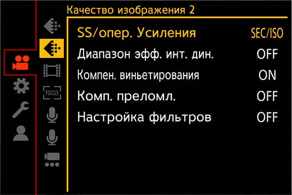 Раздел параметров камеры содержит инструменты, регулирующие работу усиления, цветовое пространство, работу автофокусировки, кнопок, информационного наполнения дисплея и даже работу вентилятора, охлаждающего начинку камеры.