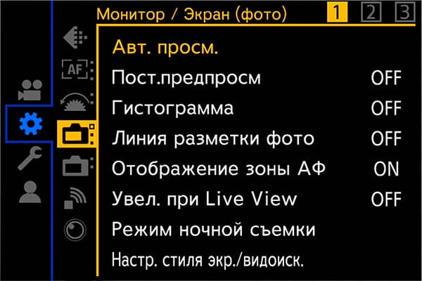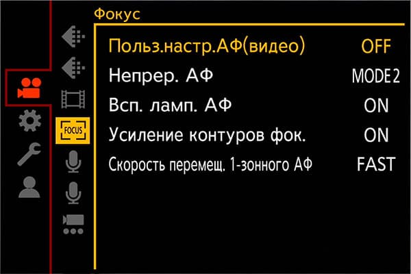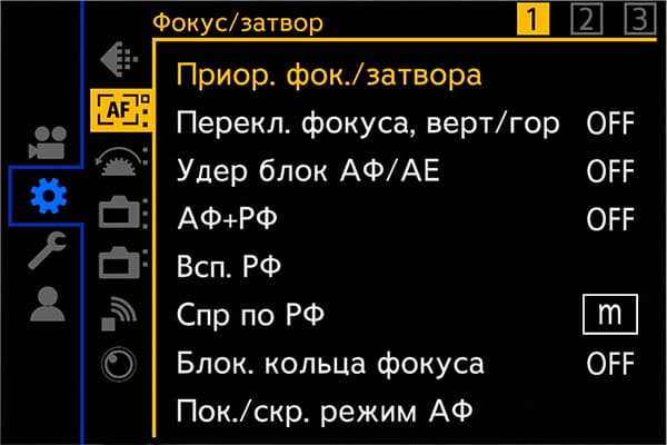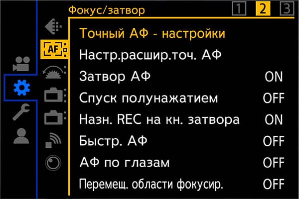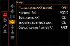 Настройки автофокуса в меню камеры позволяют изменить такие параметры, как скорость и чувствительность АФ, настроить собственные предустановки. Три отдельных главы меню содержат дополнительные инструменты Фокус/Затвор, регулирующие поведение кнопок, работу помощника по фокусировке и многие другие параметры.