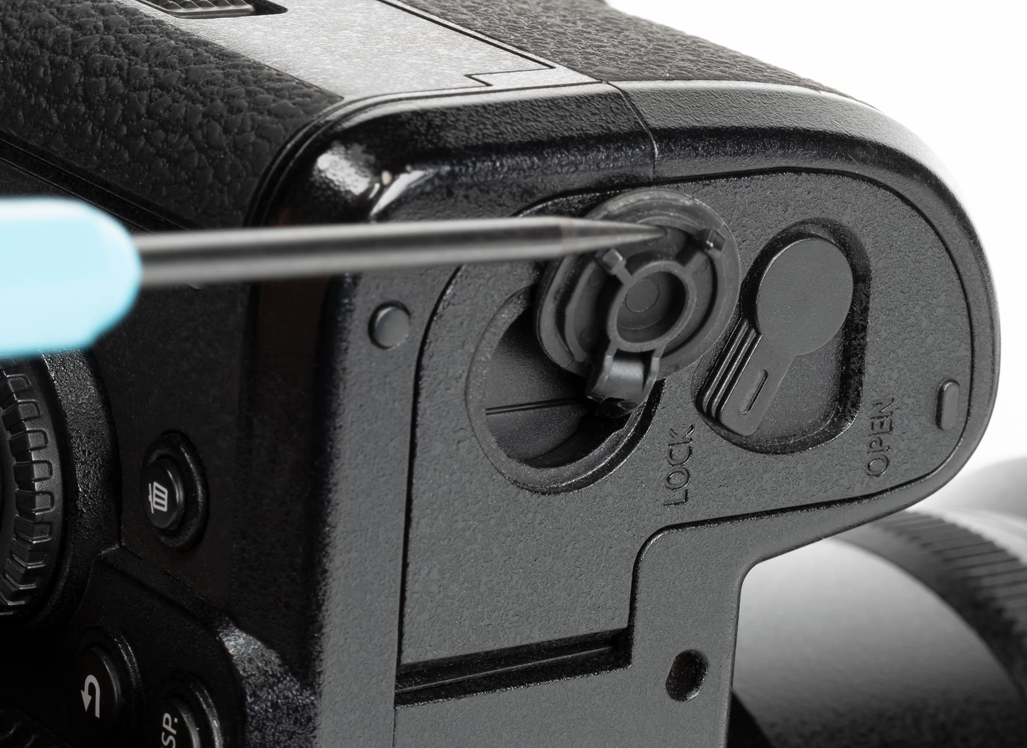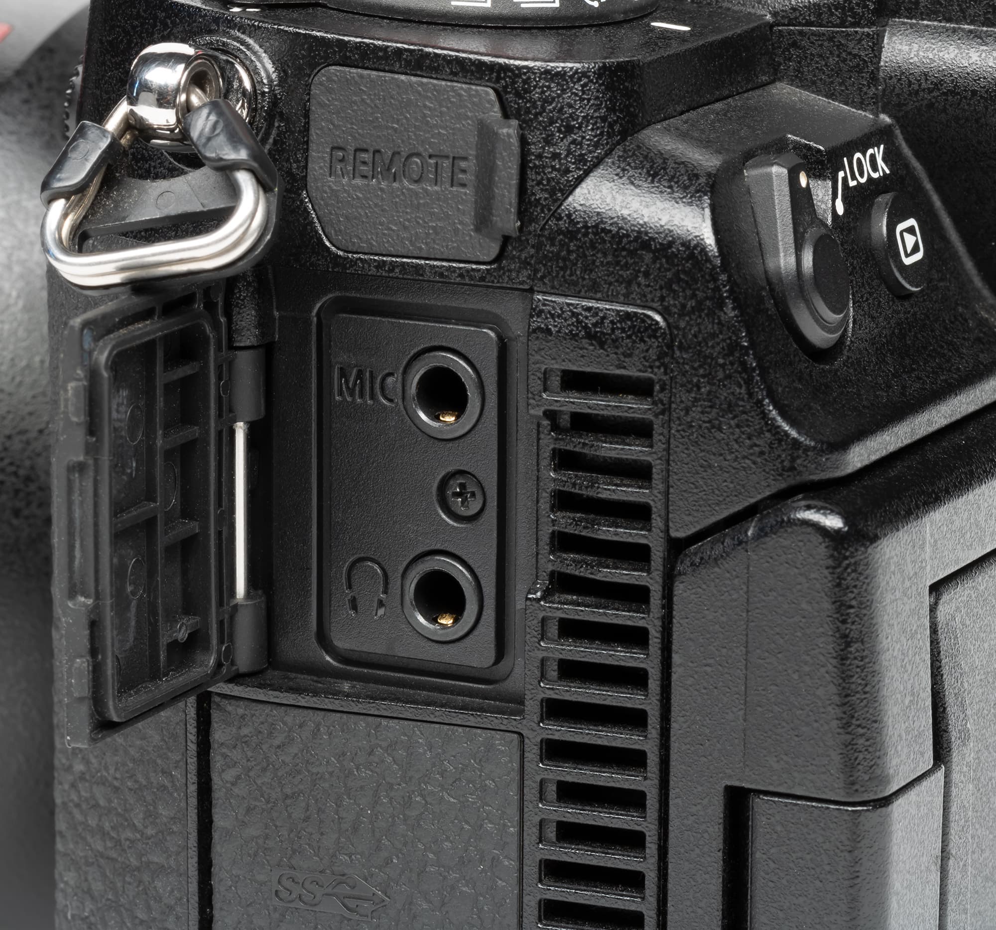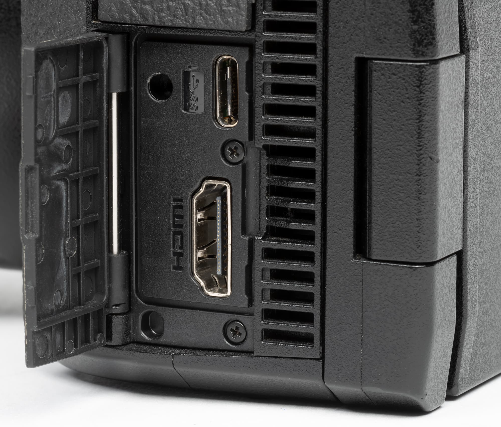 А блок HDMI+USB оснащен резьбовым отверстием для крепления кронштейна, который удерживает тяжелые кабели, тем самым предохраняя входные разъемы от перекосов. Контактная площадка под батарейную рукоятку также прикрывается резиновой заглушкой, но ее очень легко потерять, будьте внимательней.