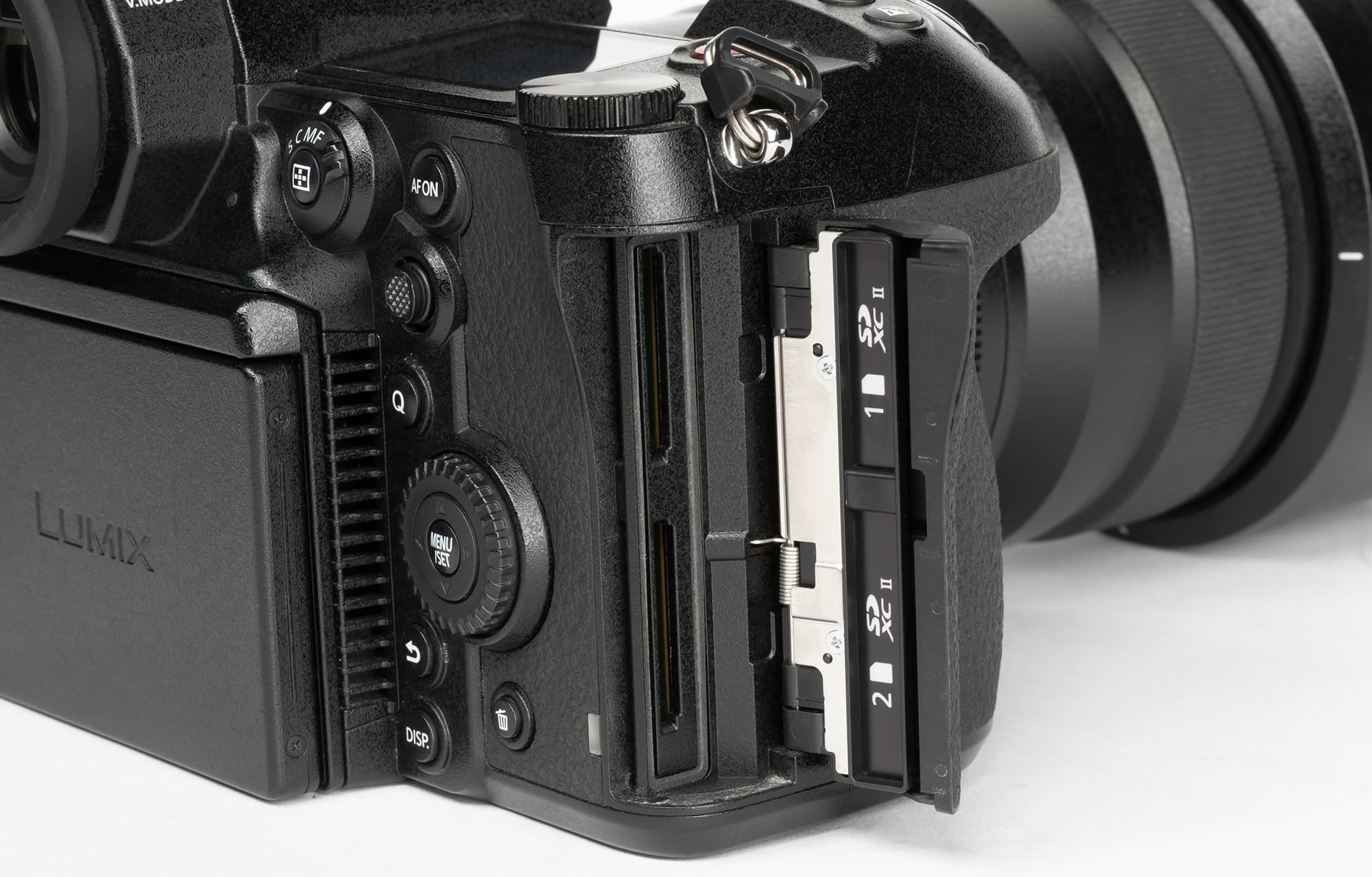 Отсек батареи тоже имеет отверстие с заглушкой, оно предназначено для установки «псевдо-батареи», позволяющей вести работу от сети. Два слота карт памяти спрятаны в правой части корпуса.