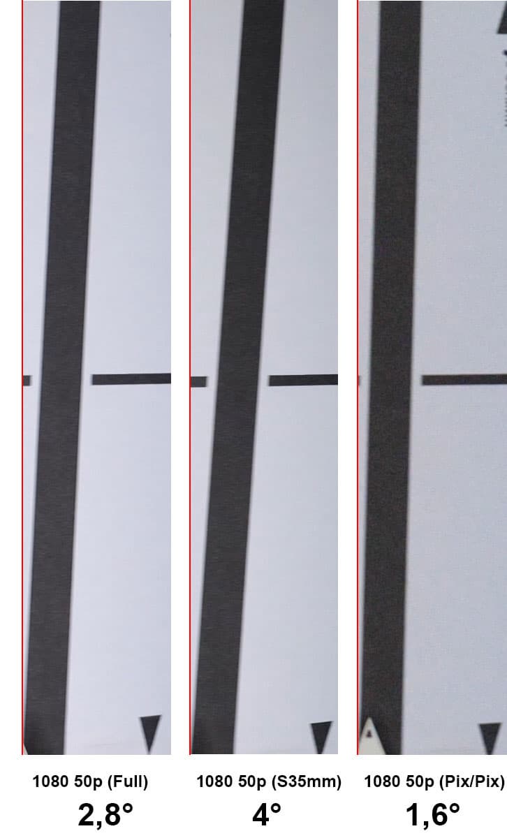 Полученный результат можно назвать достойным, особенно в сравнении с результатами, полученными в свое время при изучении камер других моделей и брендов. Например: Fujifilm X-T3 — 4,1°, Canon EOS 5D Mark IV — 8,8°, Leica SL (Typ 601) — 7,5°, Sony FDR-AX700 — 4.5° и т. д. (приведены значения, полученные при съемке в режиме 4K).