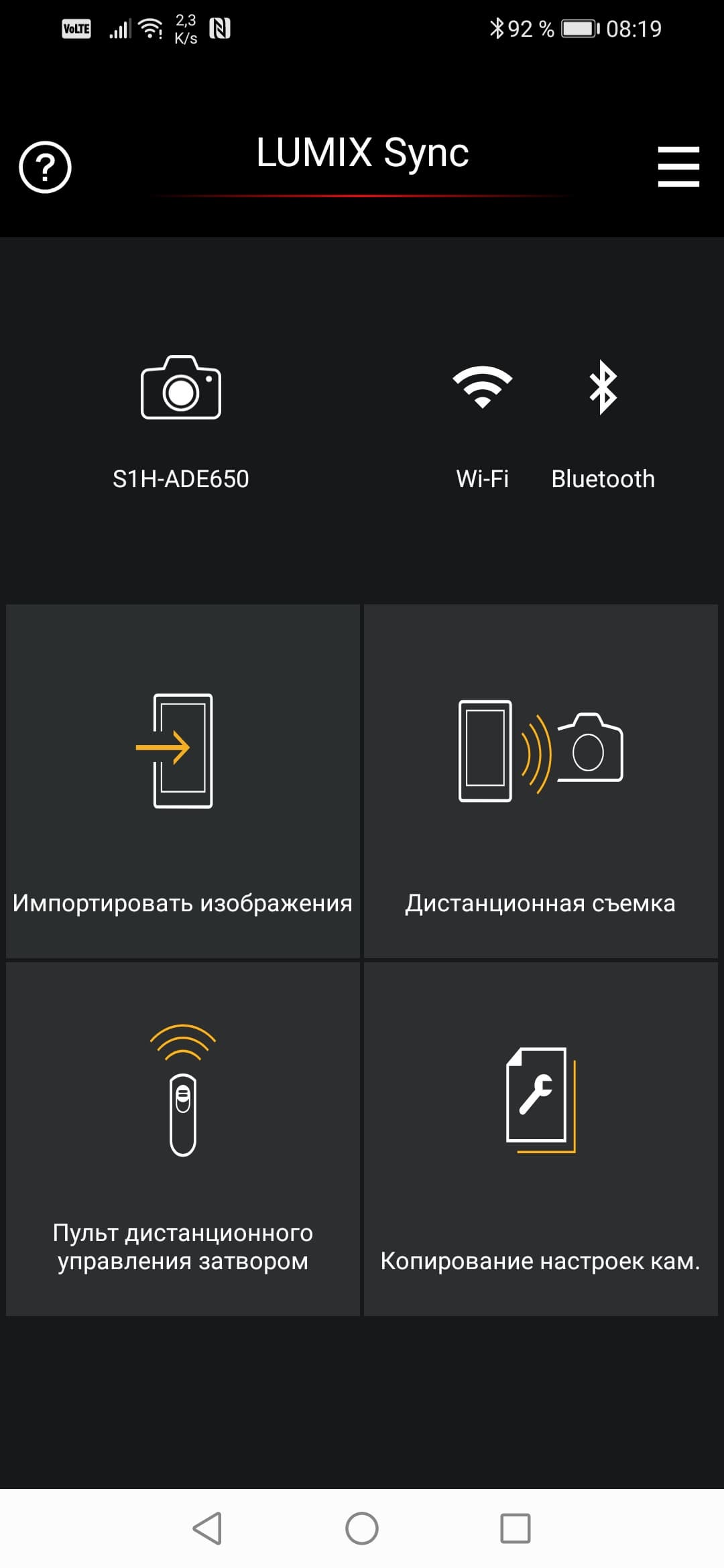 Дистанционное беспроводное управление камерой осуществляется с помощью мобильных устройств, при этом используется мобильное приложение Panasonic Lumix Sync (версия для Android, версия для iOS). Имеющийся в программе пошаговый мастер подключения можно вызвать в любой момент. Процесс подключения непрост: прежде всего нужно осуществить сопряжение камеры и смартфона посредством Bluetooth, но это не всегда удается.