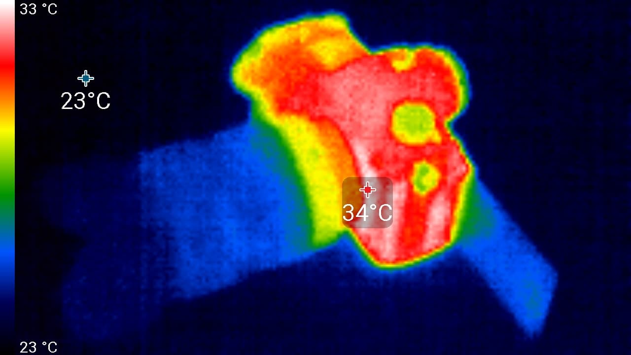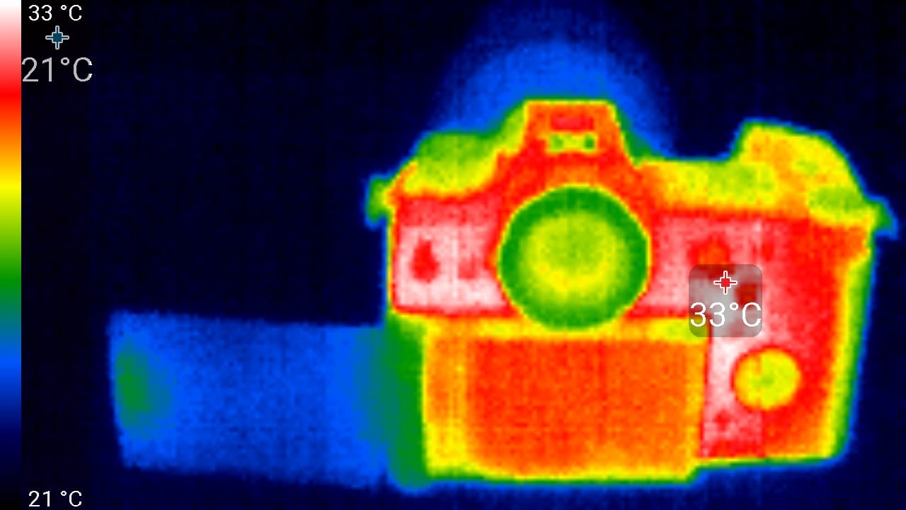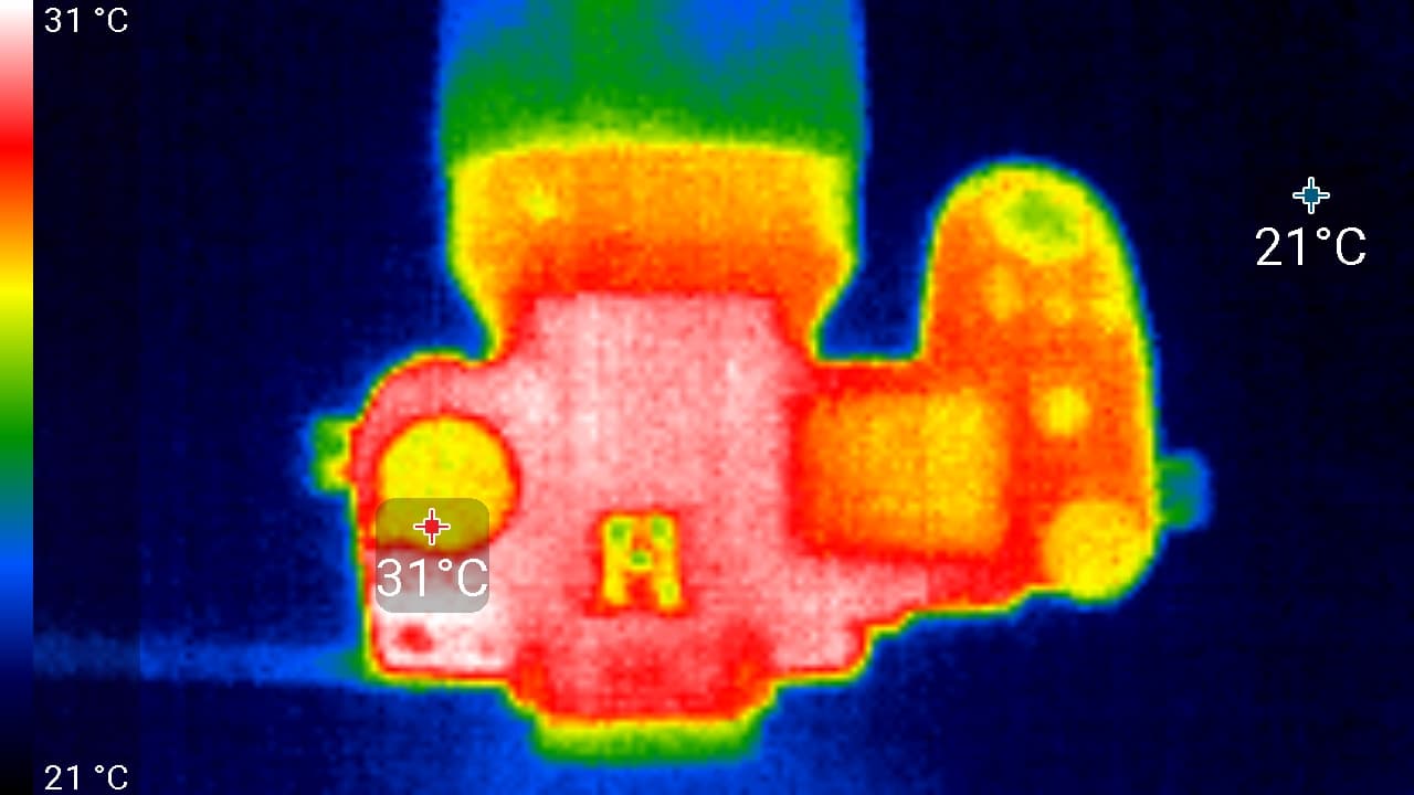 Второй практический тест касается нагрева камеры. Этот фактор совершенно некритичен для фотографов, однако волнует видеооператоров. Любопытно знать, насколько сильно нагревается камера. Следующие теплоснимки были сделаны во время долгой видеозаписи, которая в течение 60 минут проводилась в помещении с температурой около 22 °C.