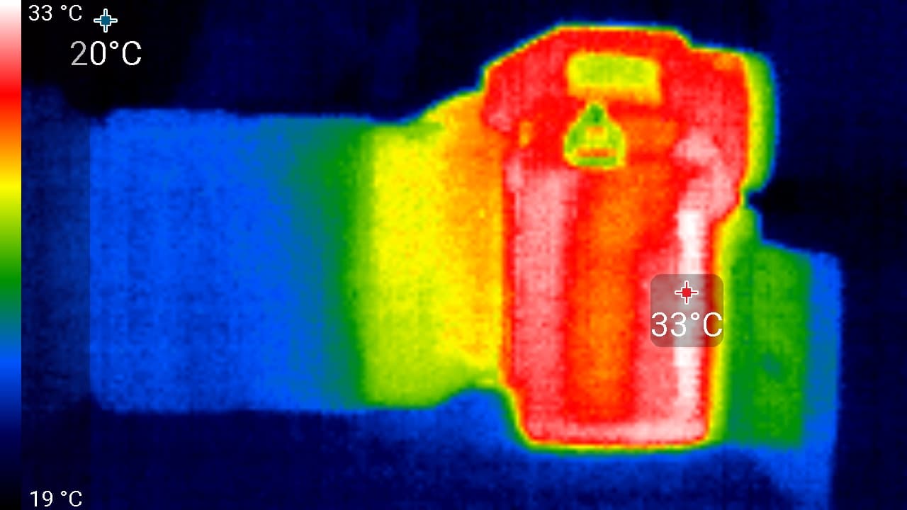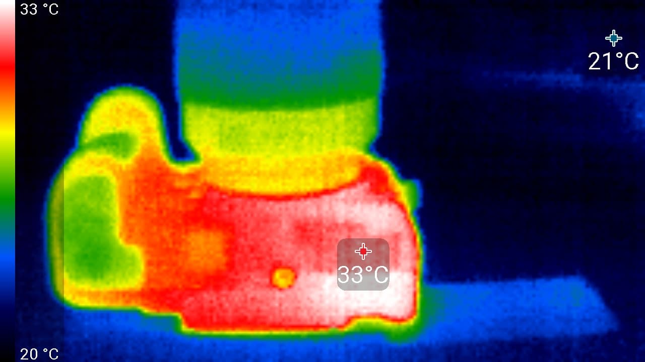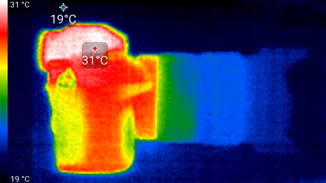 Наибольшая температура наблюдается на участке корпуса, который расположен рядом с объективом. Здесь корпус нагревается до 34 °C. Но это настолько низкий нагрев, о котором и говорить-то смешно. Вывод: нагрев рассматриваемой камеры — это последнее, о чем стоит беспокоиться пользователю. А все благодаря активной системе охлаждения.