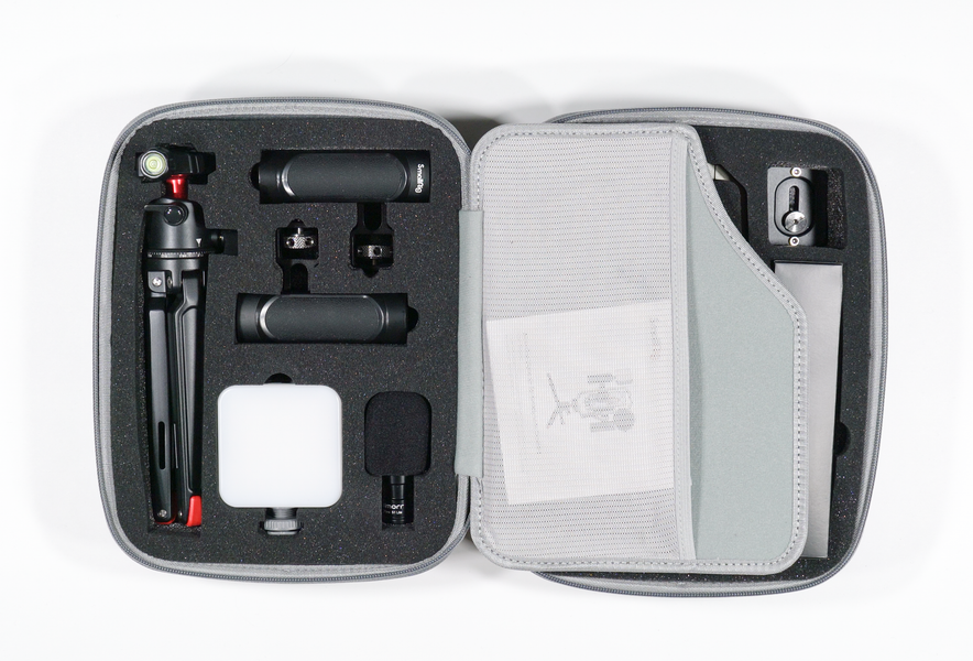 Комплект принадлежностей «всё в одном» гонконгской компании SmallRig представляет собой готовое решение для видеосъемки и стриминга при помощи смартфона. В его составе универсальная клетка, имеющая сверху 2 «холодных башмака» и 16 отверстий со стандартной штативной резьбой — по 3 на четырех боковых сторонах и 4 на центральной планке. В последней можно закрепить смартфоны шириной от 67 до 85 мм, а также пауэрбанки шириной от 53 до 85 мм. К клетке присоединяются две боковые ручки из комплекта. В набор входят также мини-штатив с панорамной головой, портативный осветитель с литий-ионной батареей, микрофон с ветрозащитой в виде колпаков из поролона и искусственного меха, аудиокабели для камеры и смартфона и адаптеры для подключения внешних питания и микрофона к iPhone и коннектору USB Type C. Комплект практически исчерпывающий. Он обеспечивает все основные потребности влогера и стримера; недостает лишь беспроводного управления видеосъемкой. В ходе практической работы конструкция, собранная на базе смартфона, пауэрбанка, клетки, микрофона и осветителя, достаточно удобна, она демонстрирует хорошие возможности стабилизации изображения. Поэтому SmallRig All in One Video Kit 3384 представляется нам хорошим выбором.