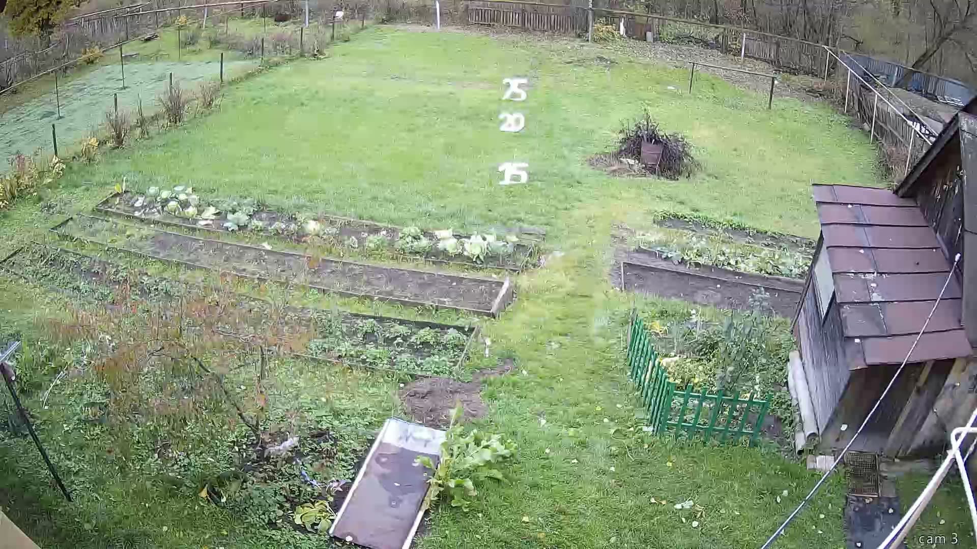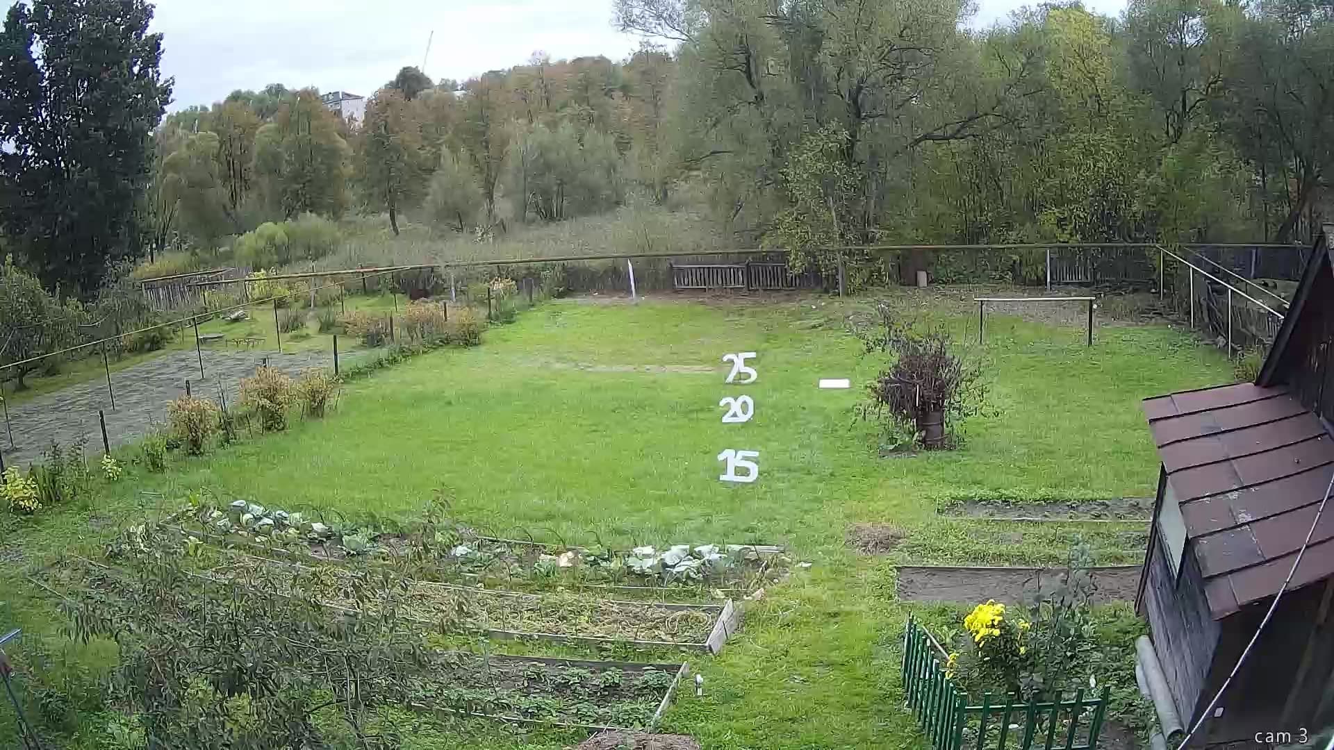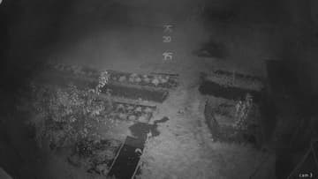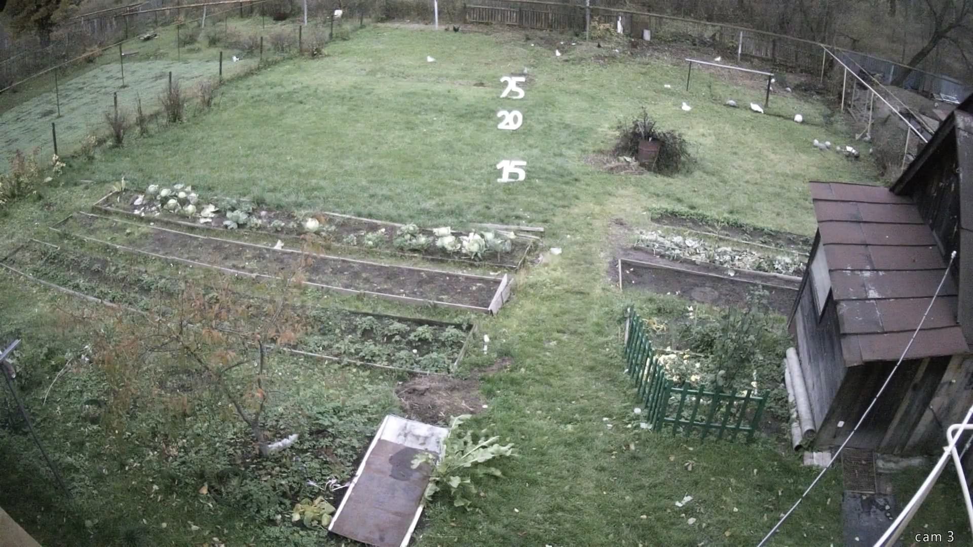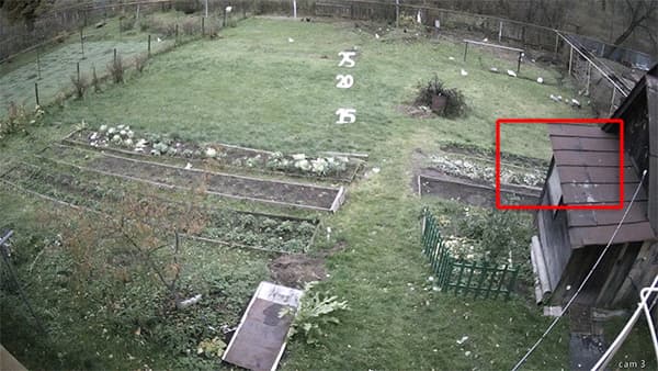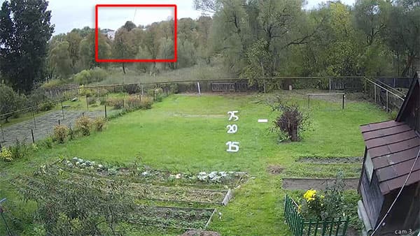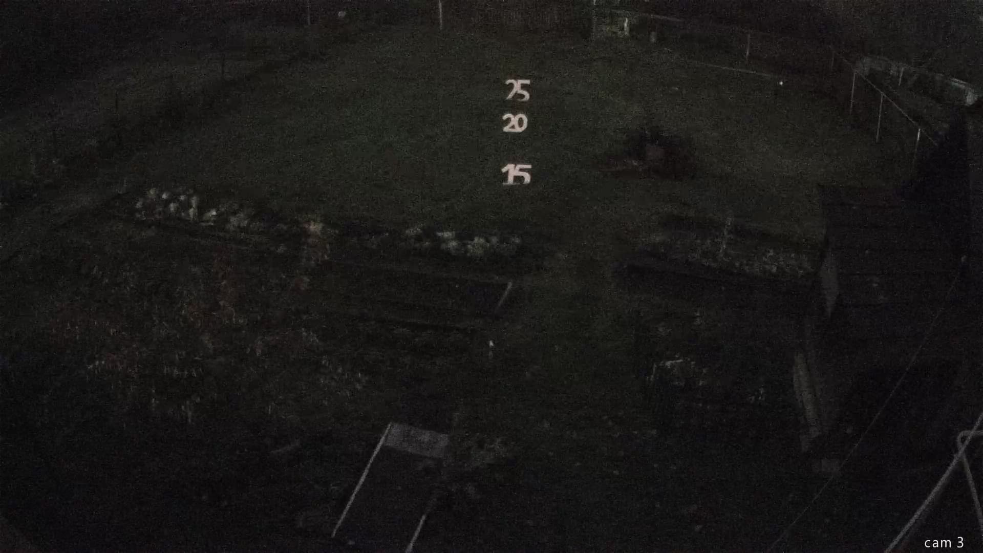 Инфракрасную подсветку камеры можно оценить как высокоэффективную. Указанные в паспорте 20 метров можно назвать не иначе как скромностью. На самом деле встроенная в камеру инфракрасная подсветка обладает мощностью, достаточной для гораздо большего проникновения вдаль. В качестве иллюстрации приведем два стоп-кадра, взятые с камеры в одно время (ночью) в режиме День и в режиме Ночь с включенной ИК-подсветкой. Крупные пластиковые цифры, расположенные в центре кадра, обозначают расстояние в метрах от камеры до цифр.