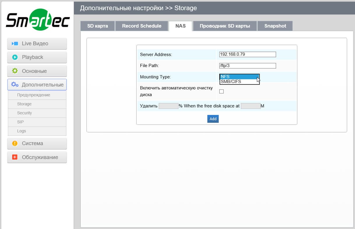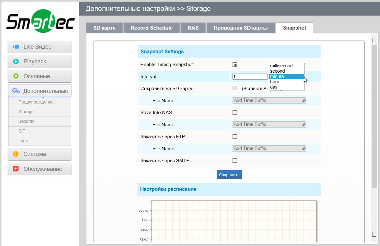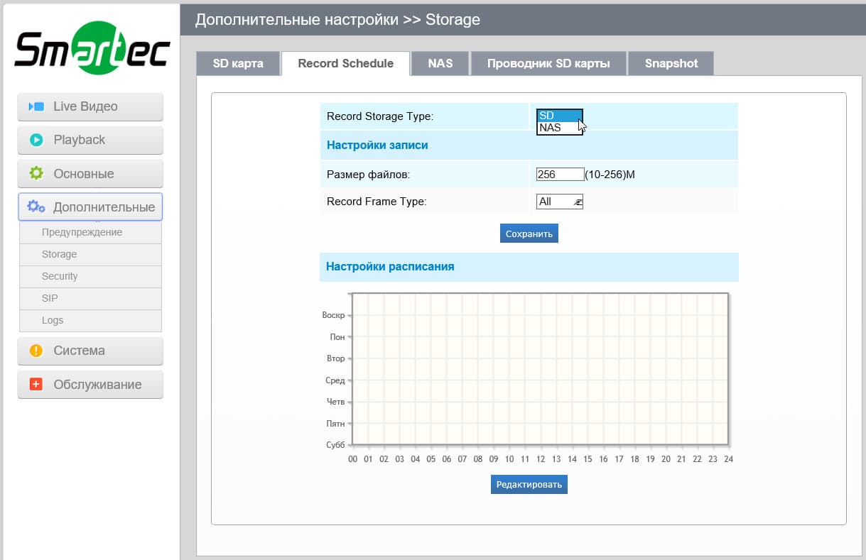 Настройки, находящиеся в подразделе Storage, позволяют выбрать хранилище для постоянной видеозаписи, видеозаписи по расписанию или для регулярного систематического сохранения стоп-кадров. В роли хранилищ могут выступать SD-карта либо сетевой накопитель (NAS). Кстати, эта ценная функция — прямая запись на NAS — встречается в IP-камерах довольно редко. Здесь же, в Storage, осуществляется доступ к содержимому карты памяти.