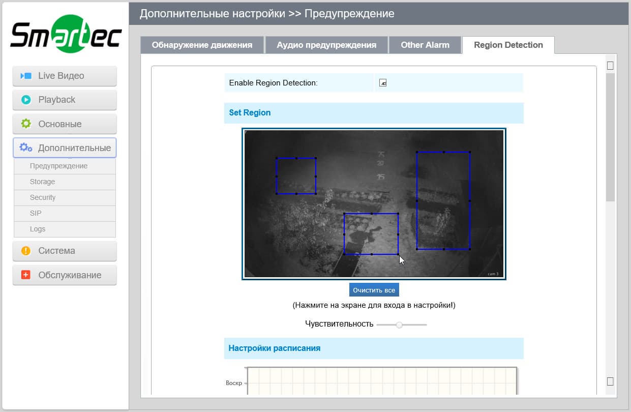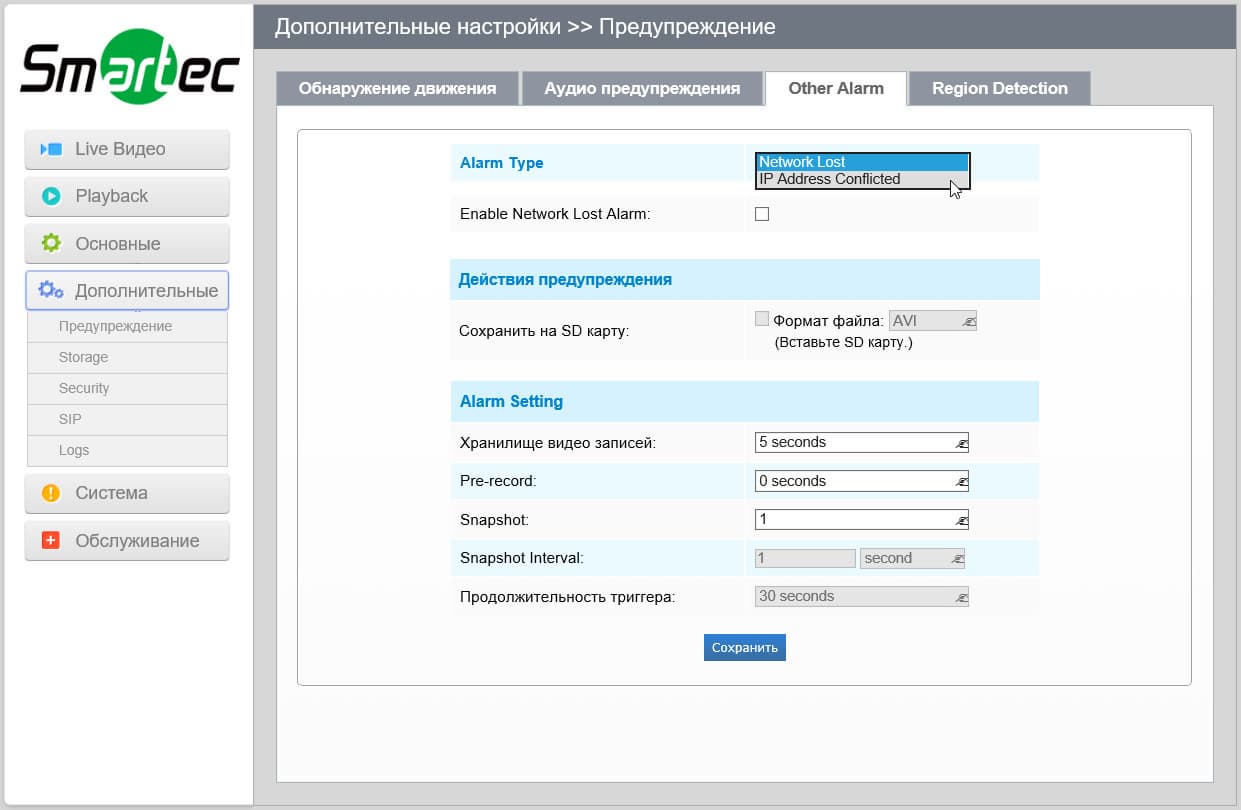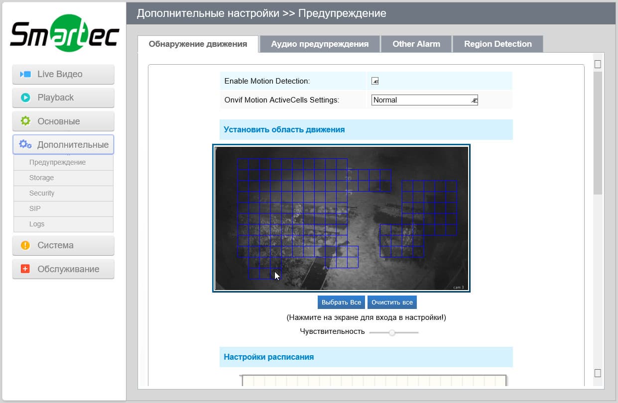 Наконец, изучим второй раздел настроек, Дополнительный. Подраздел Предупреждение состоит из инструментов, отвечающих за обнаружение событий и реакцию на тревогу.