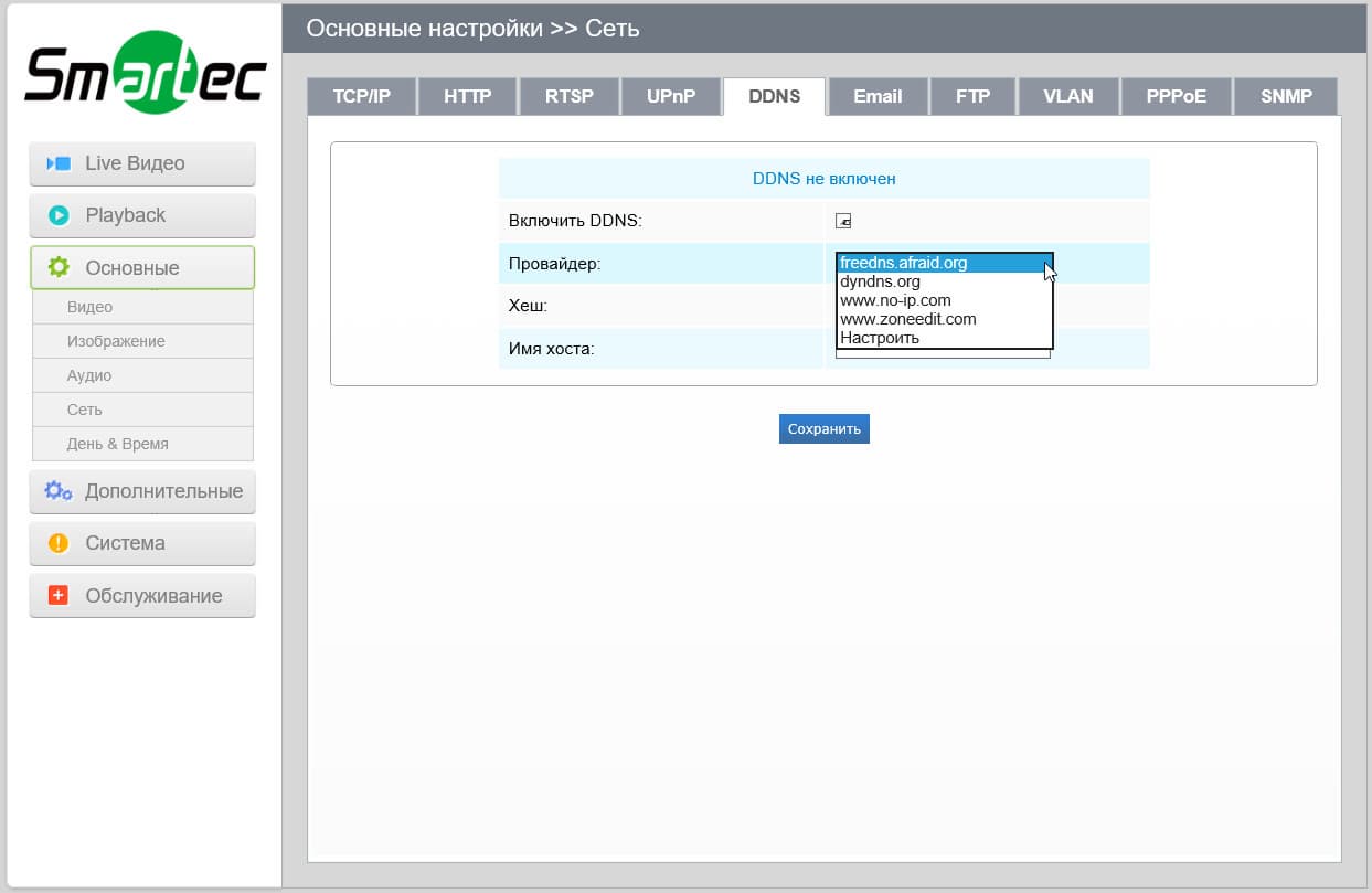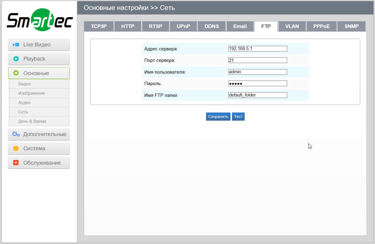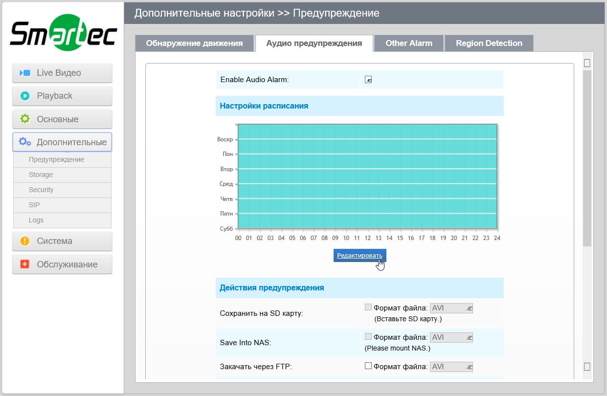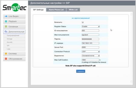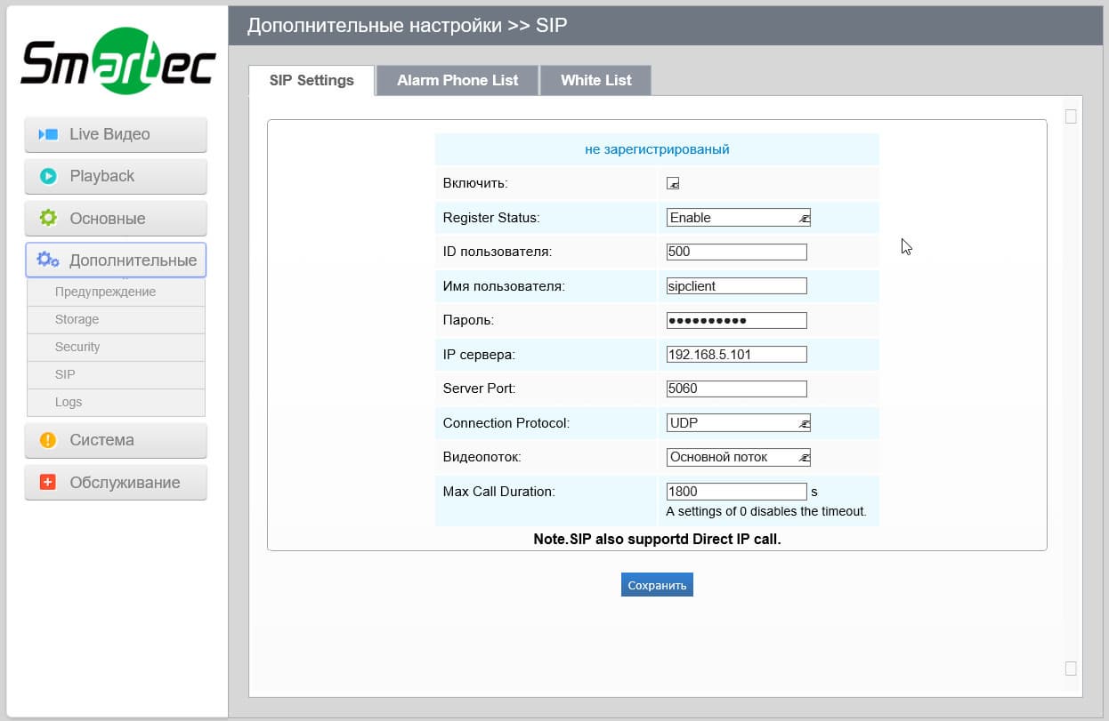 Пункт SIP хранит настройки еще одной редкой для IP-камер функции — возможности отправки голосового сообщения на IP-телефон в случае тревоги. Это самый эффективный способ разбудить прикорнувшего охранника, уставшего смотреть в мониторы.