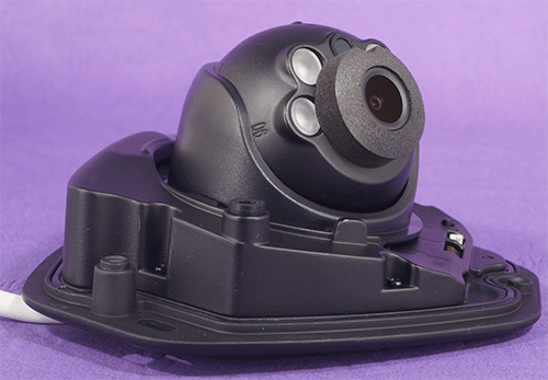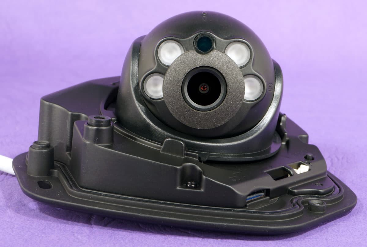 Четыре мощных инфракрасных светодиода с датчиком освещенности окружают объектив, который защищен блендой из мягкого пористого материала. Такая защита требуется для того, чтобы излучение диодов не попадало в объектив камеры — бленда плотно прижимается к прозрачной полусфере.