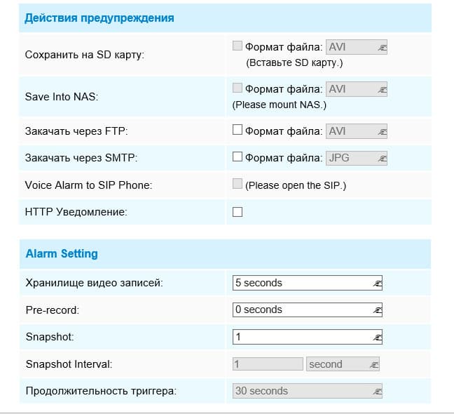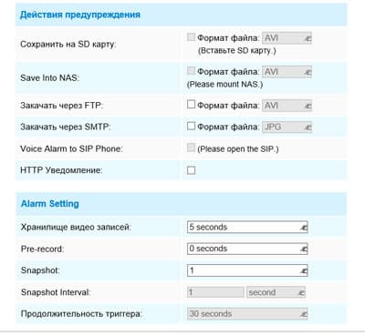 Возможные способы реакции камеры на те или иные события могут включать в себя сохранение ролика на карту памяти или в указанную папку сетевого хранилища, закачку материала на FTP-сервер, отправку снимков по электронной почте, подачу сообщения на IP-телефон и уведомление по HTTP.
