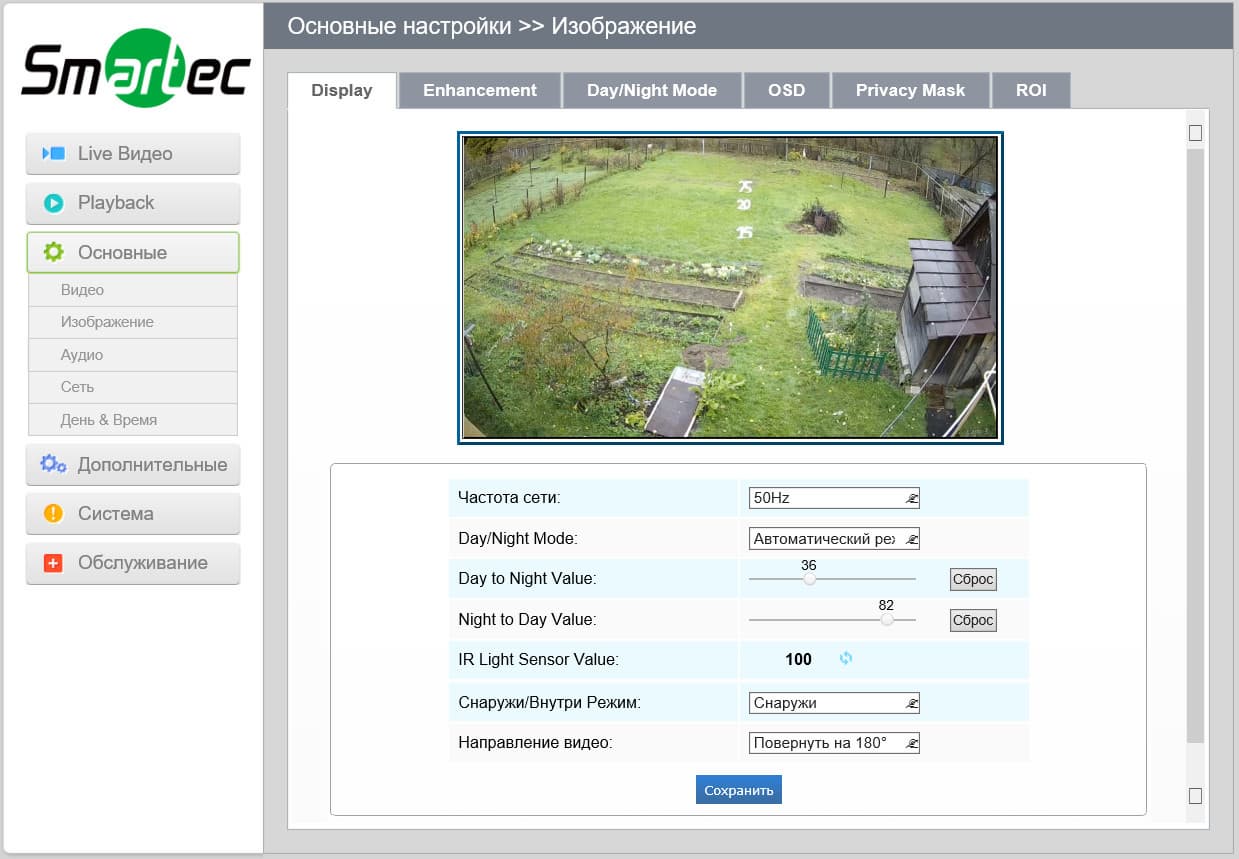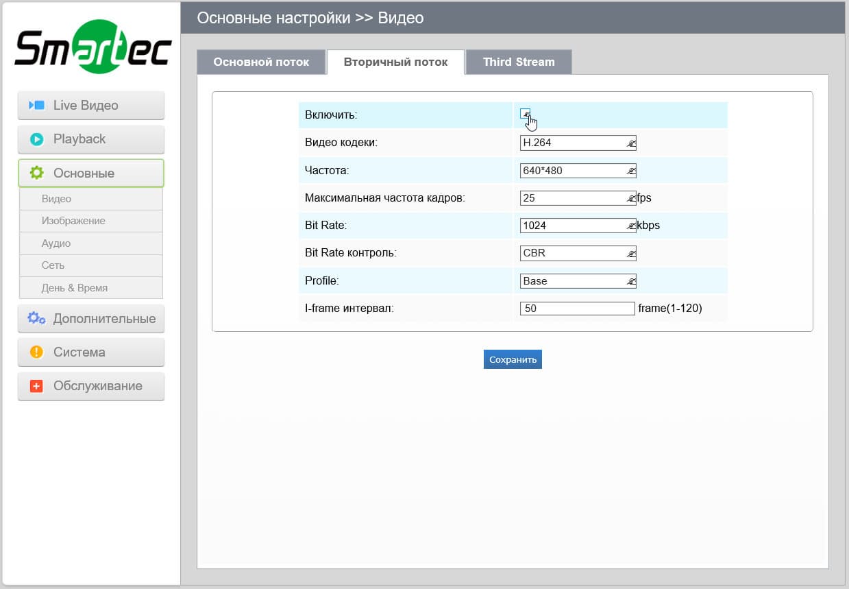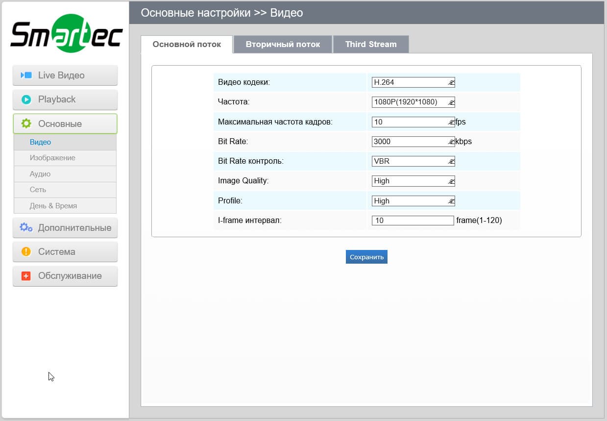 Детальные настройки аппарата разбиты на два главных раздела: основные и дополнительные. Первый раздел содержит изменяемые параметры видеопотоков, характеристик изображения, настроек звука (в рассматриваемой камере имеется встроенный микрофон), сети и синхронизации времени.
