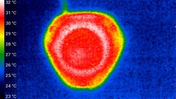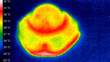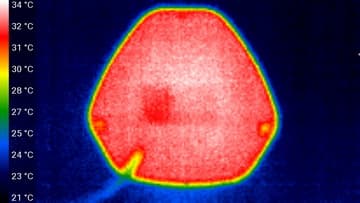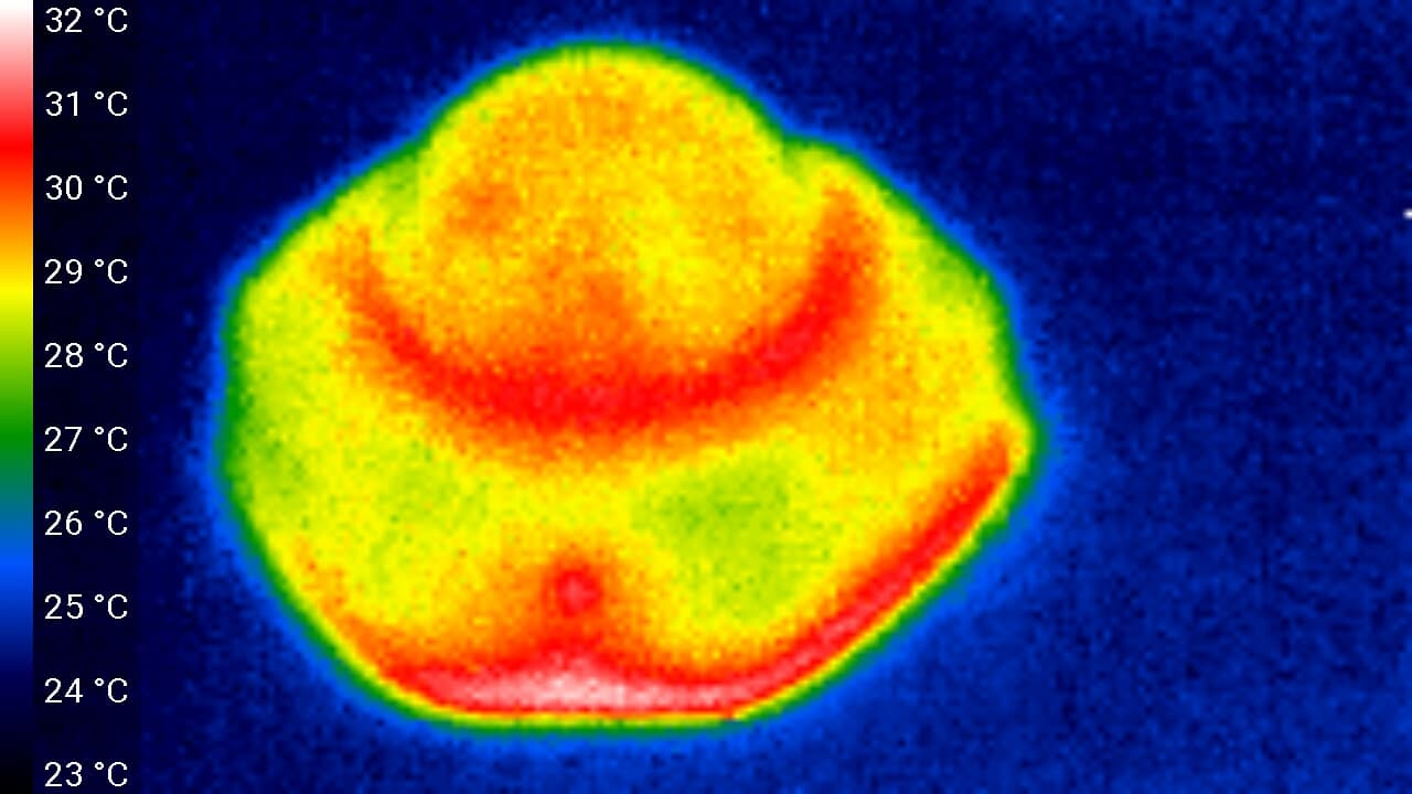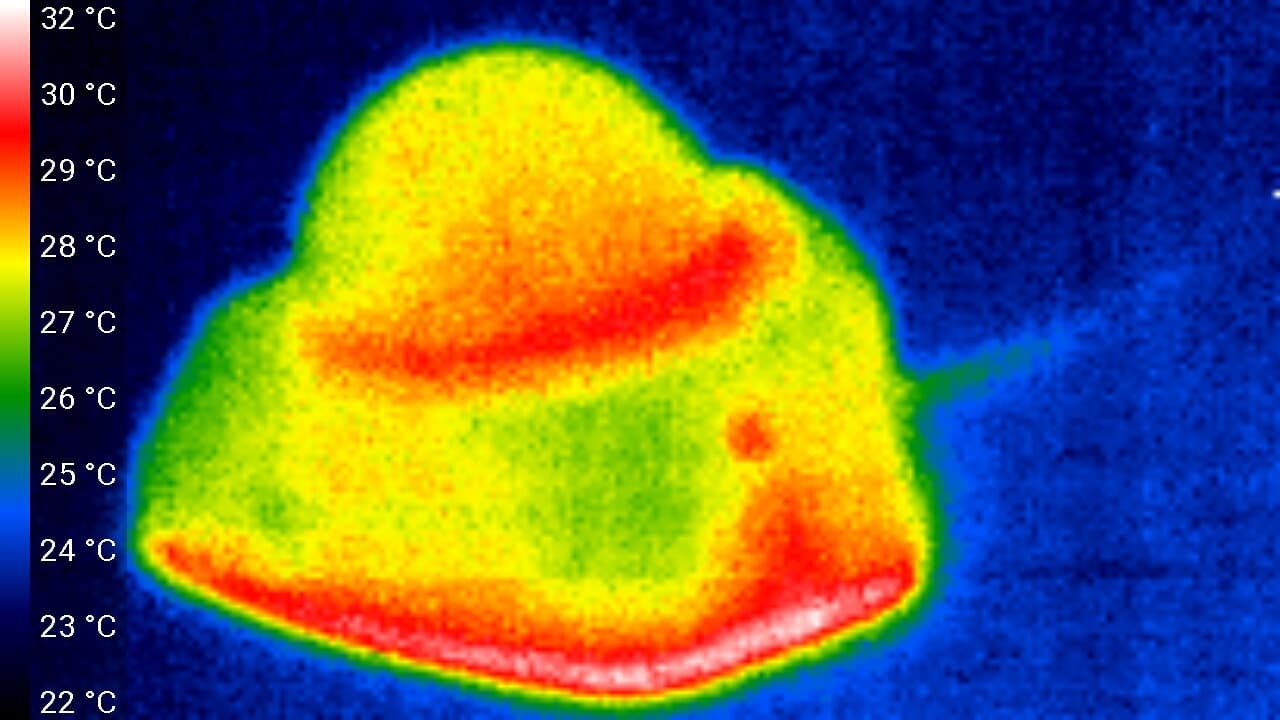 На следующих теплоснимках показана рассматриваемая камера после многочасовой беспрерывной работы в комнатных условиях. Можно видеть, что риск перегрева камеры отсутствует в принципе: максимальная температура обнаружилась в нижней части корпуса и составила всего-то 34 °C, что на несколько градусов выше окружающей.